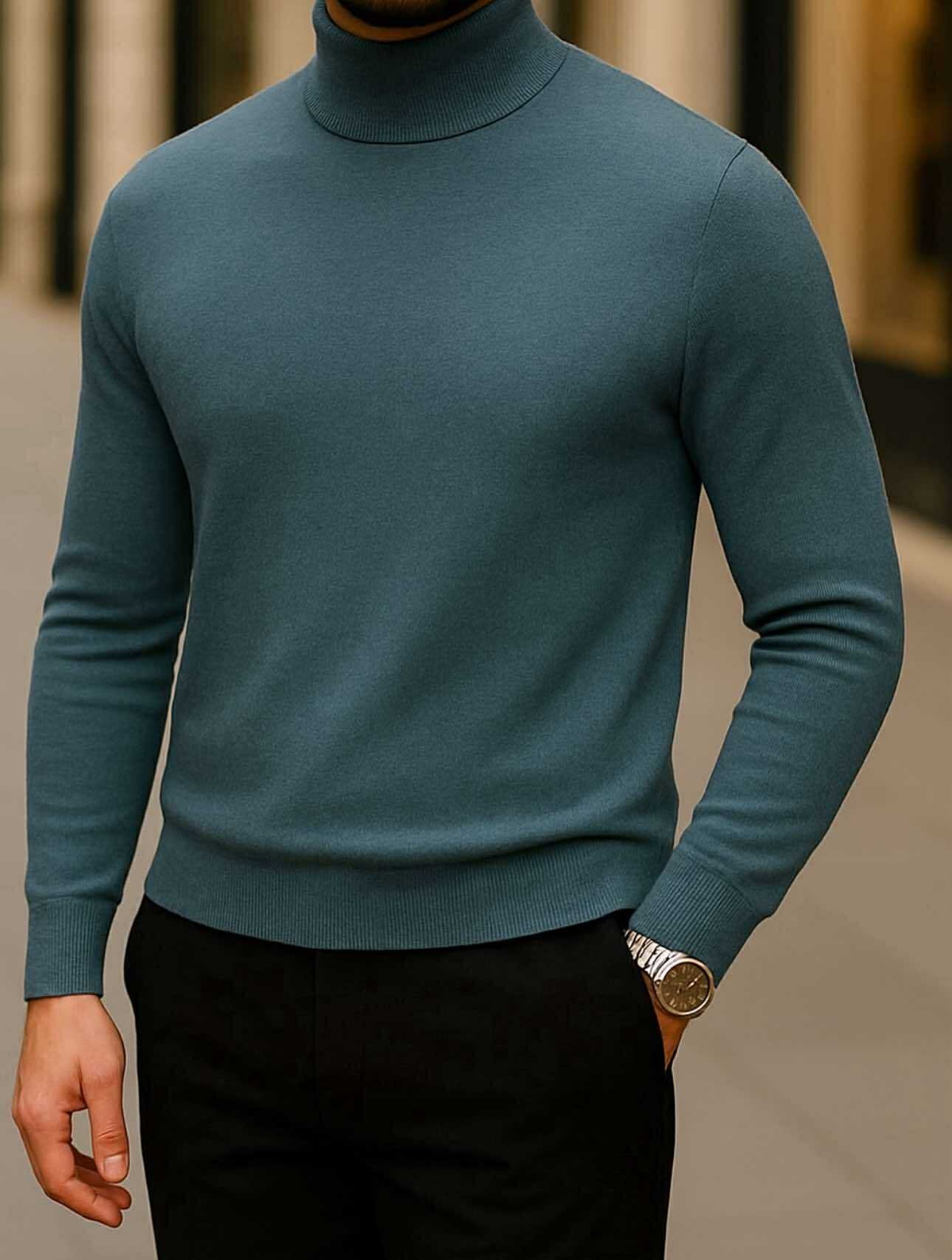 Golf elegant me ngjyrë blu-petrol, i punuar me pëlhurë të butë dhe elastike për rehati maksimale. Dizajni minimalist dhe prerja slim-fit e bëjnë perfekt për kombinime urbane dhe elegante, duke i dhënë një pamje të pastër dhe moderne çdo veshjeje. Ideale për t’u veshur nën pallto, xhupa lëkure apo bomber për stil të sofistikuar “street-luxury”.