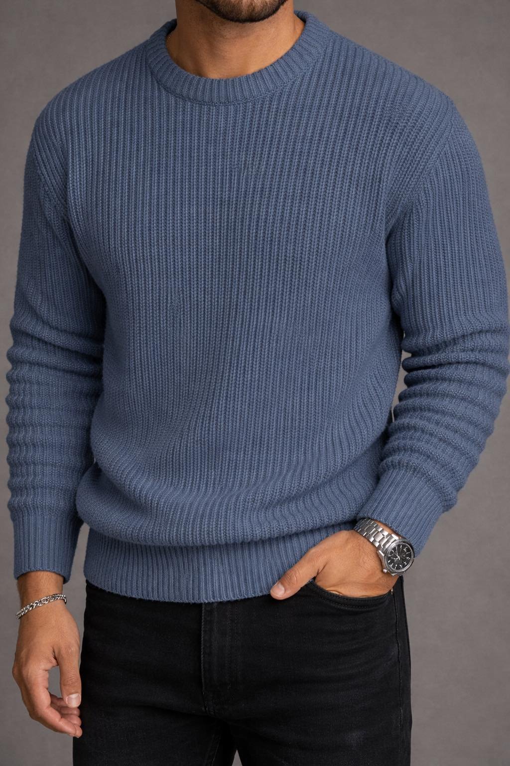 Golf premium për meshkuj me thurje ribbed, i dizajnuar për një stil modern dhe të pastër. Struktura vertikale e thurjes i jep pamje elegante dhe ndihmon në një siluetë më të rregullt, duke e bërë ideal për kombinime casual apo smart-casual.