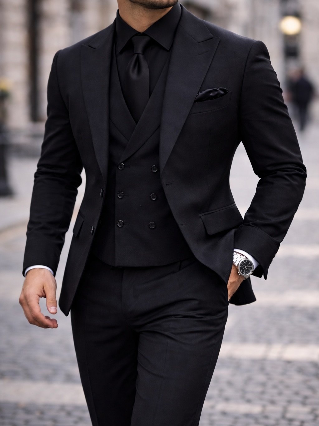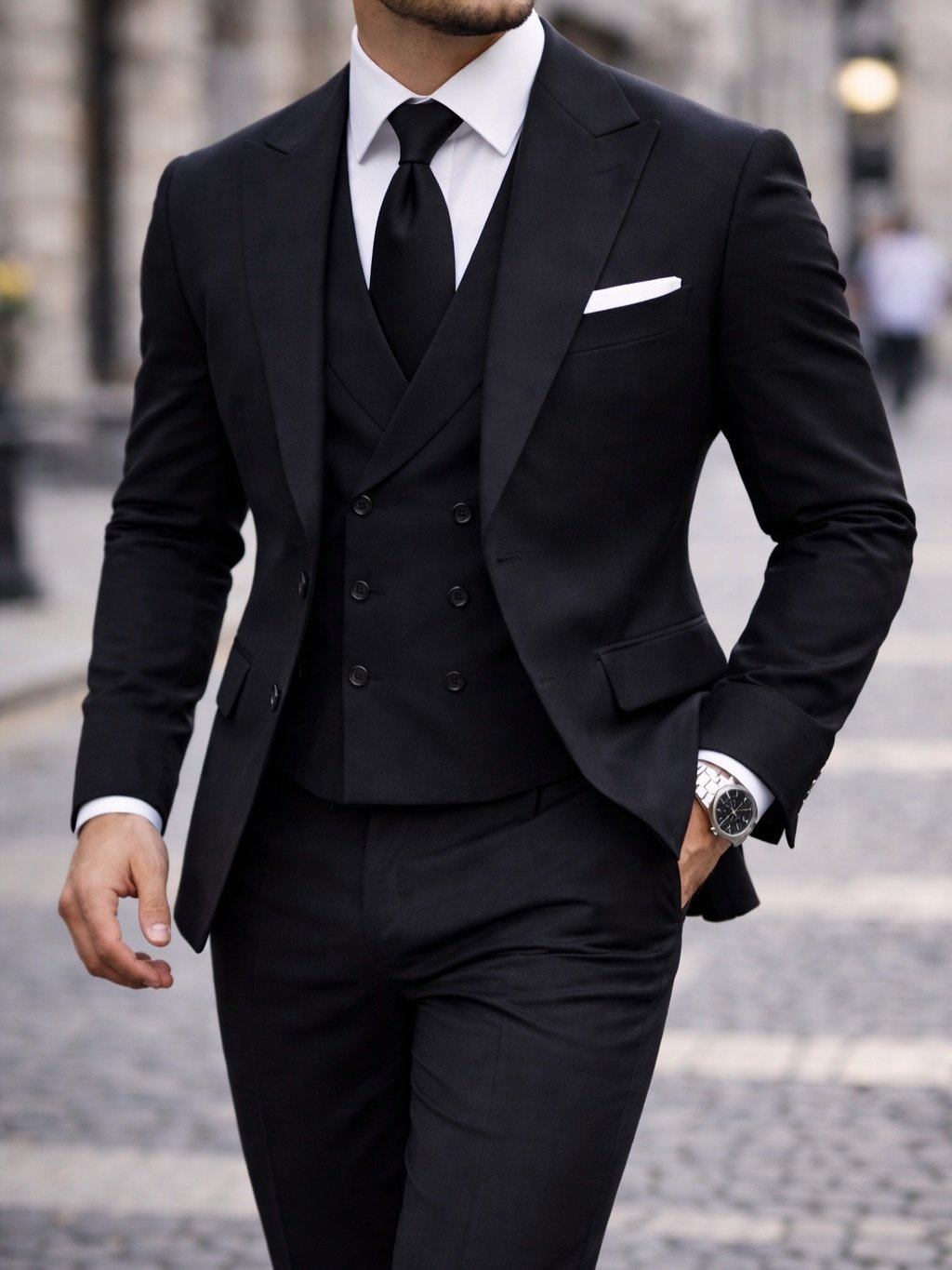 Versioni “total black” ofron një pamje moderne dhe misterioze, ndërsa kombinimi me këmishë të bardhë sjell kontrast klasik dhe elegancë të përjetshme.