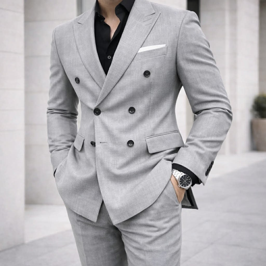 Ky kostum gri përfaqëson kombinimin perfekt të elegancës klasike dhe stilit modern. Me dizajn double-breasted dhe prerje slim-fit, ai krijon një siluetë të rregullt dhe të sofistikuar që përshtatet në mënyrë ideale me trupin. Ngjyra gri e hapur e bën këtë set shumë të versatil, duke ofruar një pamje të pastër dhe elegante për çdo rast.