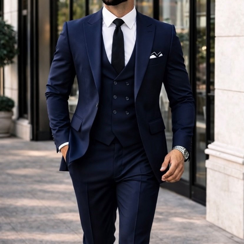 Një kostum që përfaqëson elegancën moderne në formën e saj më të pastër. Ky kostum navy blue premium 3-pjesësh është krijuar për mashkullin që kërkon stil të lartë, vetëbesim dhe prezencë të fortë në çdo paraqitje. Me sakon elegante, jelekun double-breasted dhe kombinimin perfekt me këmishë të bardhë e kollare të zezë, ky model sjell një pamje luksoze, të rafinuar dhe shumë moderne.