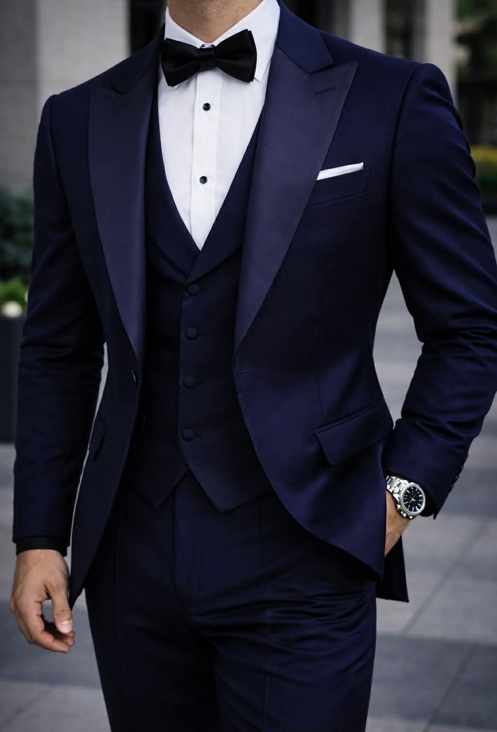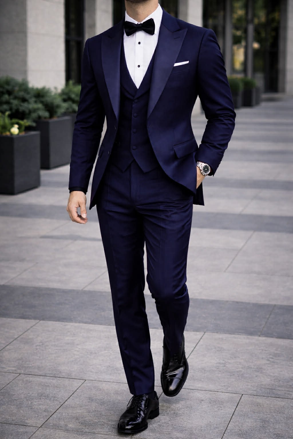 Ngjyra blu navy sjell një kombinim ideal mes stilit klasik dhe modern, ndërsa detajet si këmisha e bardhë dhe papioni i zi krijojnë një kontrast të pastër dhe shumë elegant. Ky kostum është perfekt për evente formale si dasma, gala, mbrëmje speciale apo evente biznesi.