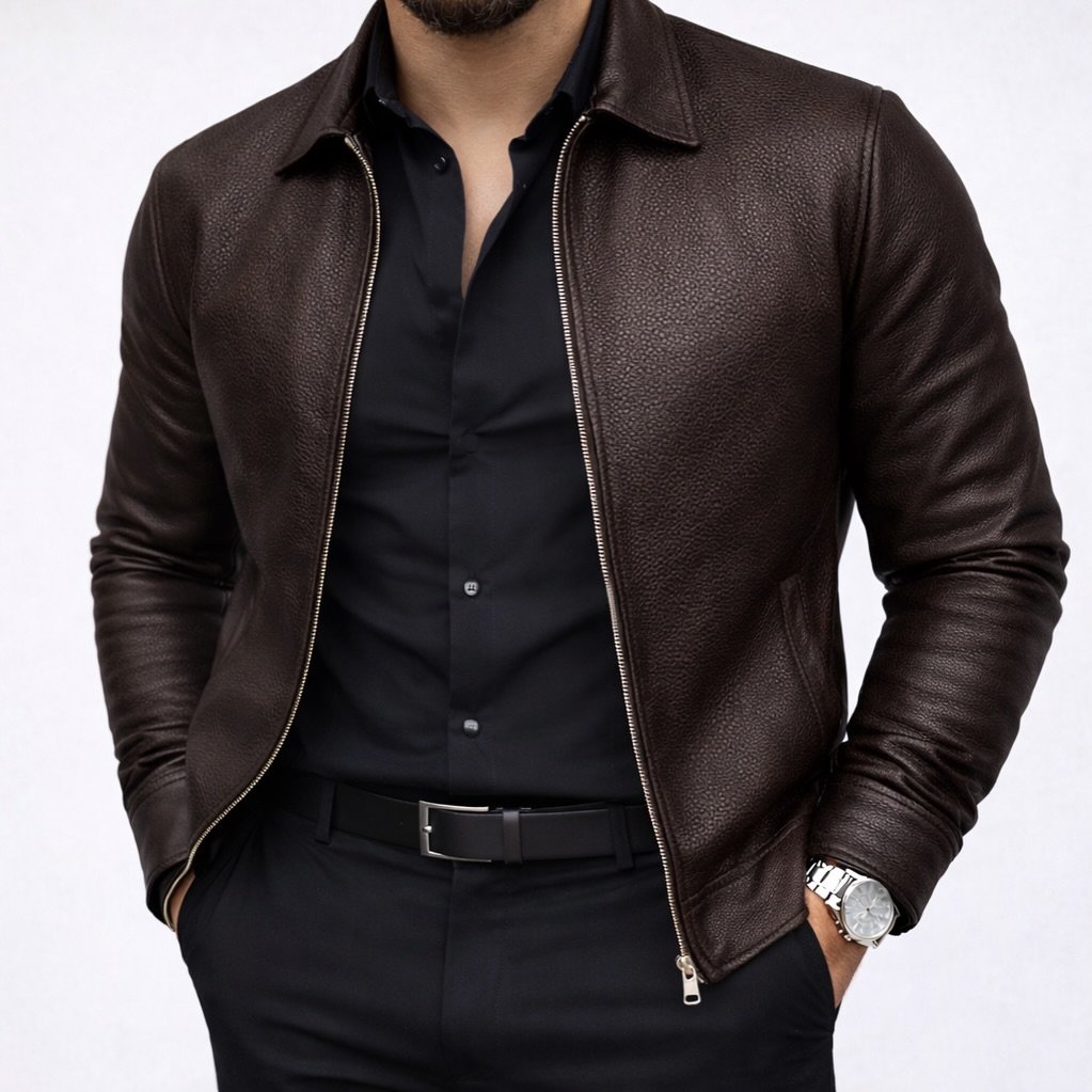 Xhaketat prej lëkure në nuanca klasike – e zezë dhe kafe e errët – sjellin një balancë perfekte mes stilit urban dhe luksit të përditshëm. Tekstura e pasur dhe prerja e strukturuar theksojnë siluetën mashkullore, ndërsa kombinimi me total black outfit krijon një prezencë të fuqishme dhe të sigurt.