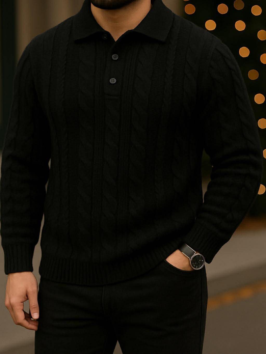 Modeli Men’s Premium Cable Knit Polo – Black vjen si një pjesë ikonike e sezonit, duke kombinuar elegancën e një polo-je klasike me luksin e strukturës cable knit. Materiali i butë dhe premium që rri bukur në trup ofron ngrohtësi, komoditet dhe një pamje të rafinuar urbane.