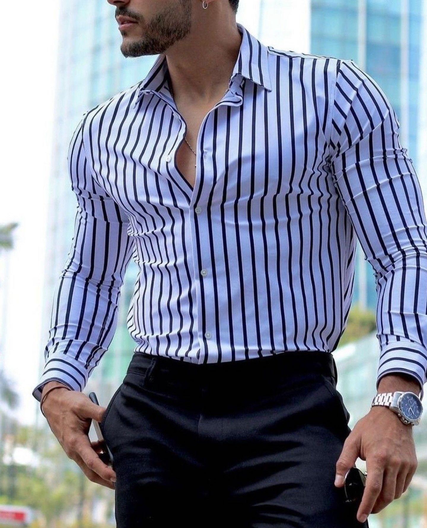 Ngritni pamjen tuaj formale me këtë këmishë elegante dhe të ngushtë për meshkuj. Me vija vertikale të theksuara në të zezën klasike mbi një bazë të bardhë të freskët, kjo këmishë është projektuar për të nxjerrë në pah fizikun tuaj me prerjen e saj të personalizuar dhe materialin elastik.