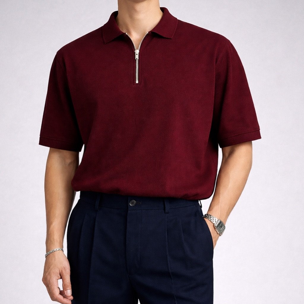 Polo moderne me dizajn minimalist dhe zip metalik premium, e krijuar për një pamje elegante dhe të sofistikuar. Prerja e rregullt dhe linjat e pastra e bëjnë ideale për kombinime smart-casual apo elegante.