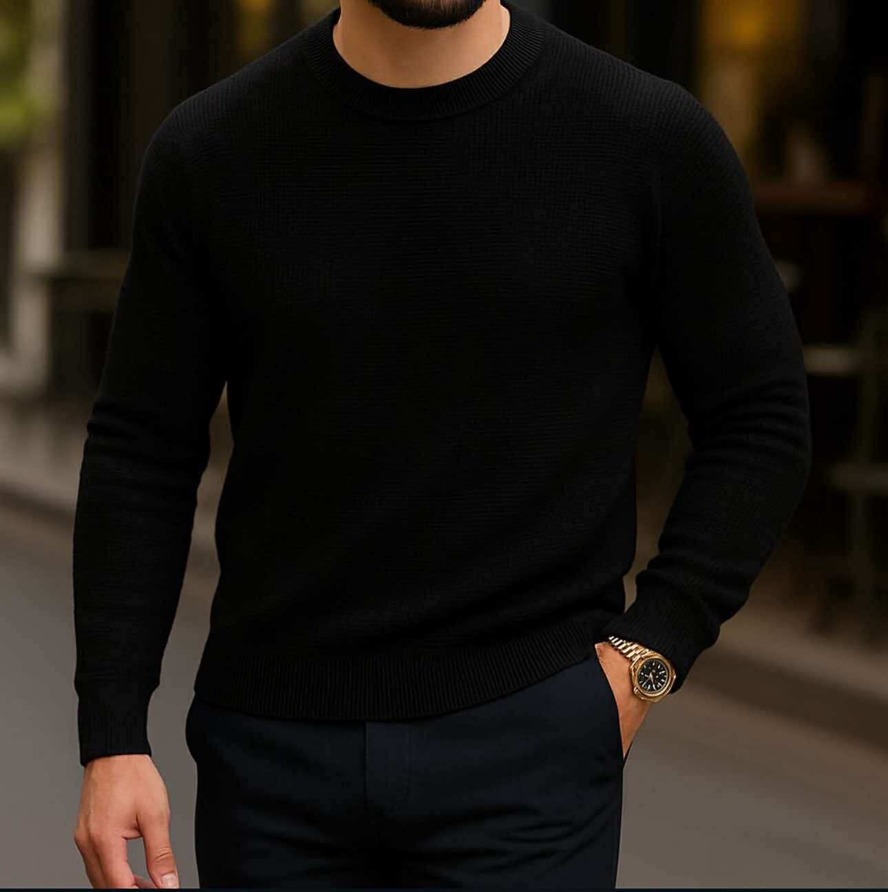 Kjo pulovër e zezë elegante është një zgjedhje e përjetshme për çdo garderobë mashkullore. Materiali cilësor siguron butësi dhe rehati, ndërsa dizajni minimalist me jakë rrethore dhe mëngë të gjata i jep një pamje moderne dhe të rafinuar.