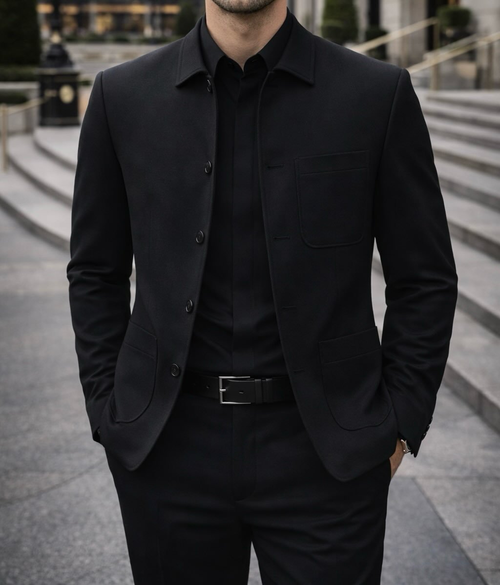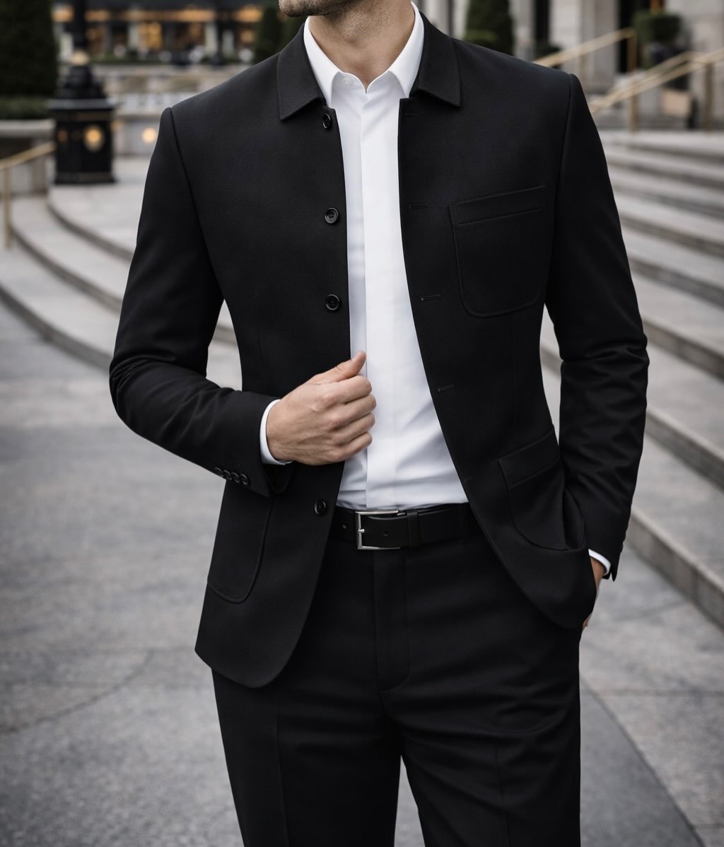 Set elegant për meshkuj në ngjyrë të zezë klasike, i punuar për një pamje të pastër, moderne dhe shumë premium. Xhaketa me prerje të rregullt dhe detaje minimaliste kombinohet në mënyrë perfekte me pantallonat elegante, duke krijuar një outfit të fortë, luksoz dhe shumë të lehtë për kombinim. Mund të vishet me këmishë të zezë për një paraqitje all black më të guximshme, ose me këmishë të bardhë për një kontrast më klasik dhe të sofistikuar. Ideal për mbrëmje, evente, darka speciale dhe çdo rast ku dëshiron të dukesh me stil, serioz dhe plot prezencë.