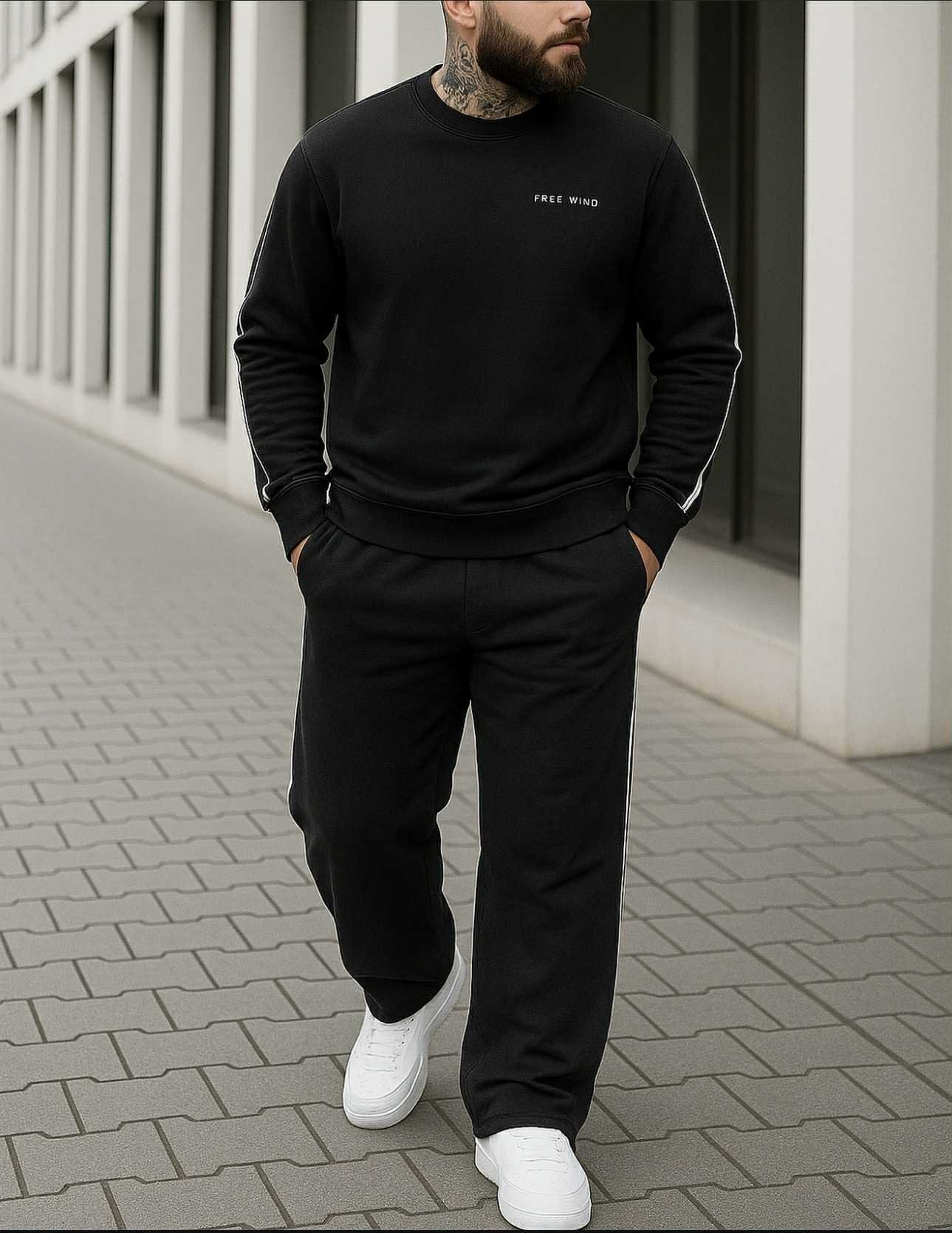 Dizajni total black me detaje anësore dhe mbishkrimin “FREE WIND” në pjesën e sipërme sjell një pamje urbane dhe moderne, ideale për përditshmëri, udhëtime apo daljet e relaksuara. Kombinimi me atlete të bardha e bën look-un të pastër dhe premium.