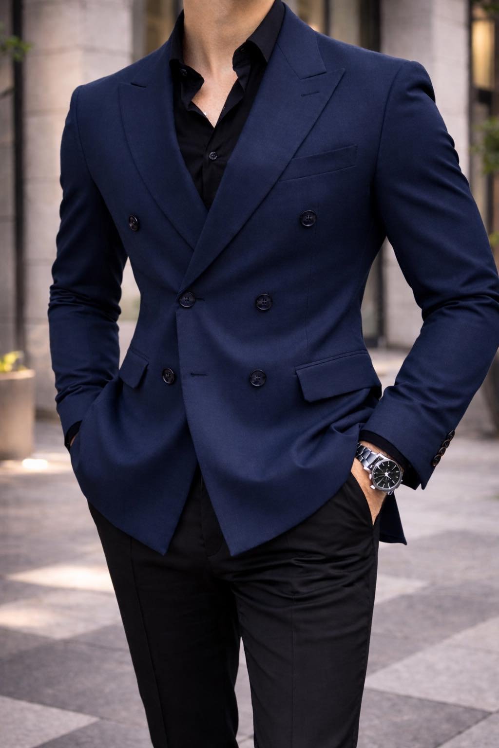 Kjo xhaketë në ngjyrë navy është një zgjedhje perfekte për një stil elegant dhe të përjetshëm. Dizajni double-breasted i kombinuar me prerjen slim-fit krijon një siluetë të pastër dhe autoritare, ndërsa nuanca e thellë blu sjell klas dhe finesë. E kombinuar me këmishë të zezë, kjo xhaketë ofron një pamje moderne dhe shumë të sofistikuar, ideale për evente formale dhe biznes.