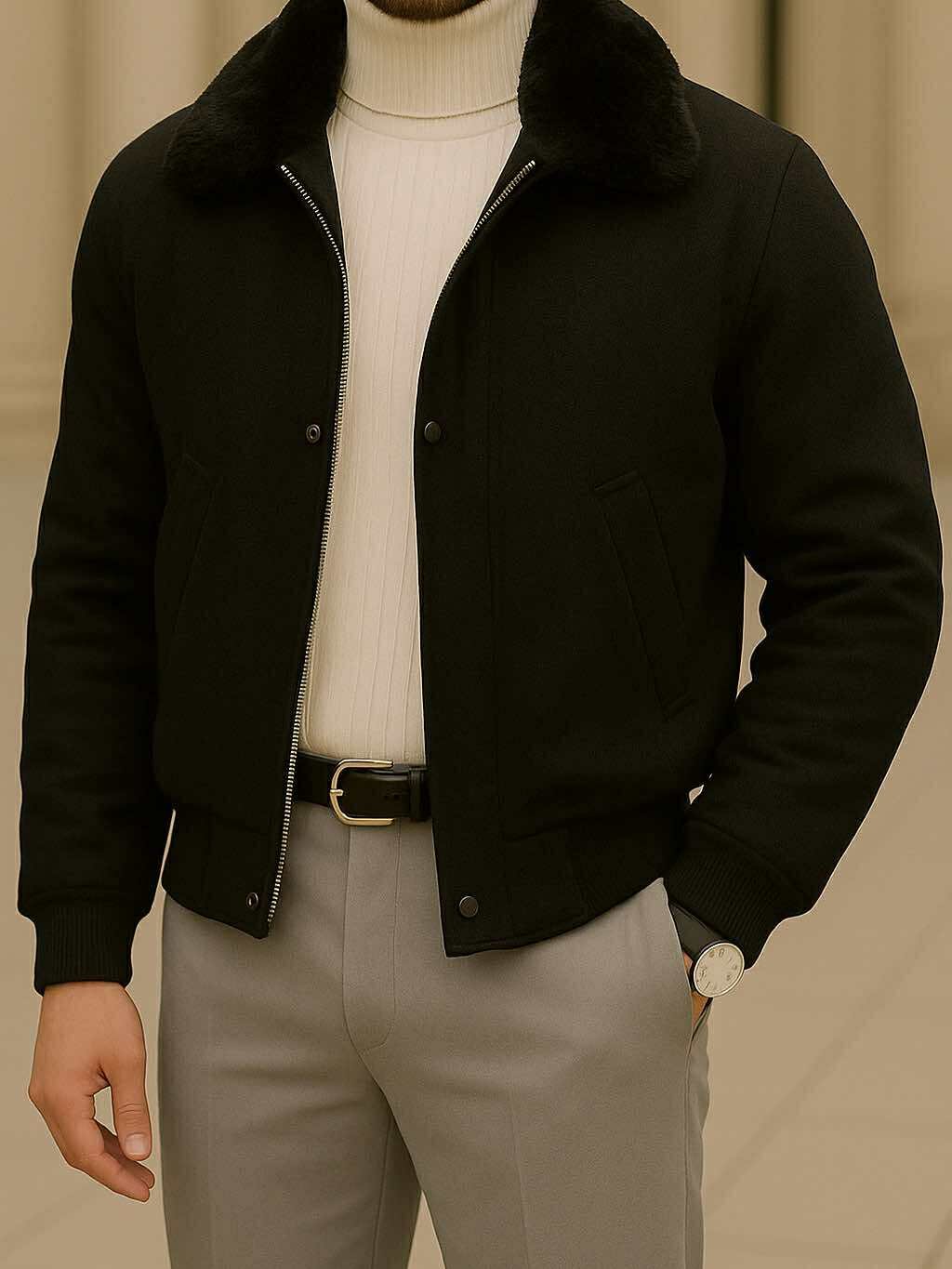 Kjo xhaketë e zezë me jakë pelushi përfaqëson përkufizimin e elegancës urbane. E punuar me kujdes nga material pambuku i trashë me efekt mat, ajo ofron kombinimin perfekt mes ngrohtësisë dhe stilit. Jakë pelushi e butë shton luksin vizual dhe ndjesinë e rehatisë, ndërsa dizajni me zip të fshehur dhe kopsa metalike i jep një prekje moderne.