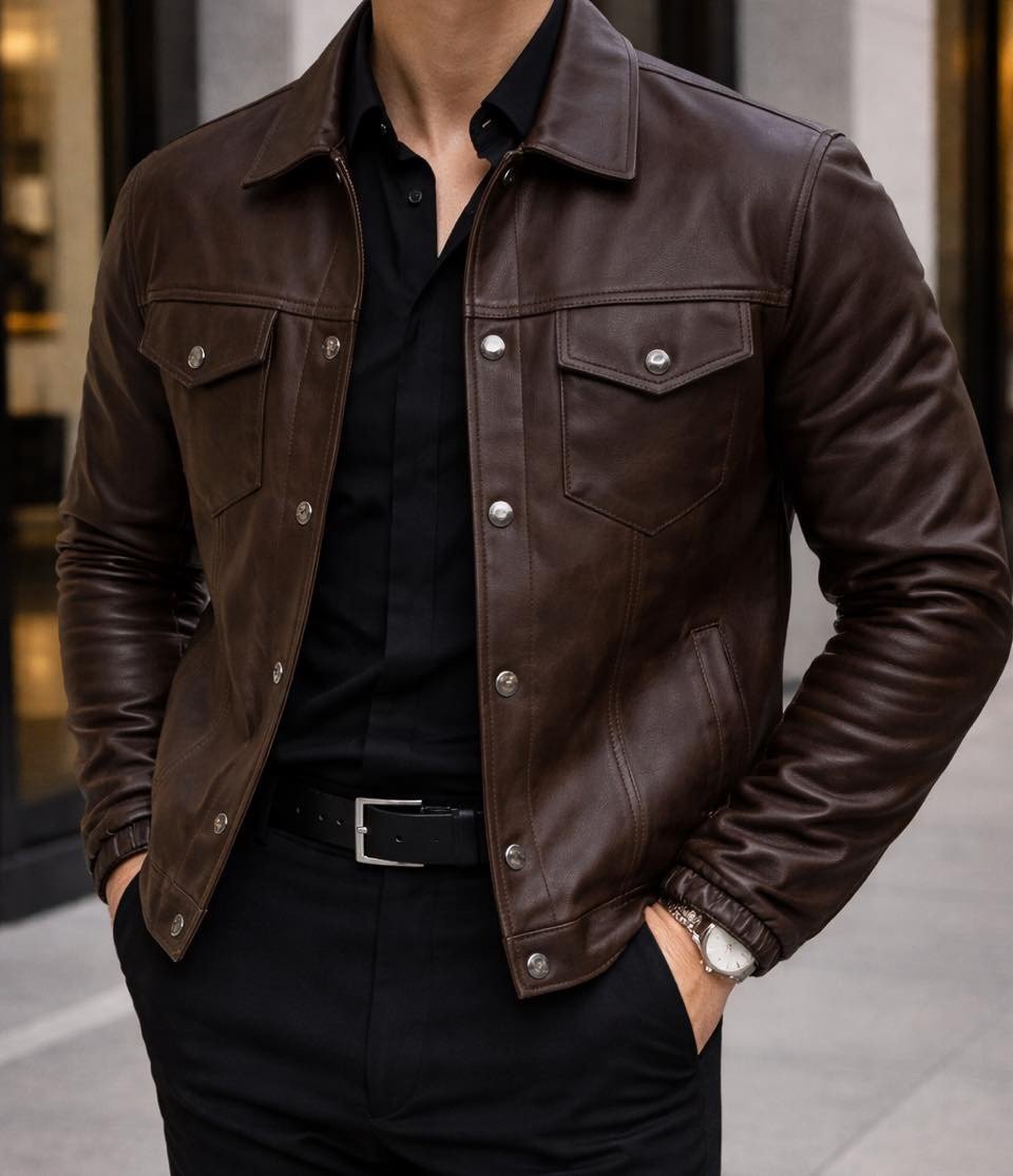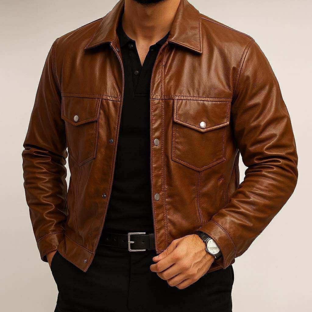 Xhaketë prej eco-lekure premium në ngjyrë kafe karamel, e dizajnuar për meshkuj që duan një pamje klasike, të pastër dhe urbane. Modeli me dy xhepa me kapak në gjoks, kopsa metalike kromi dhe qepje të theksuara krijon një stil elegant që i qëndron kohës.
