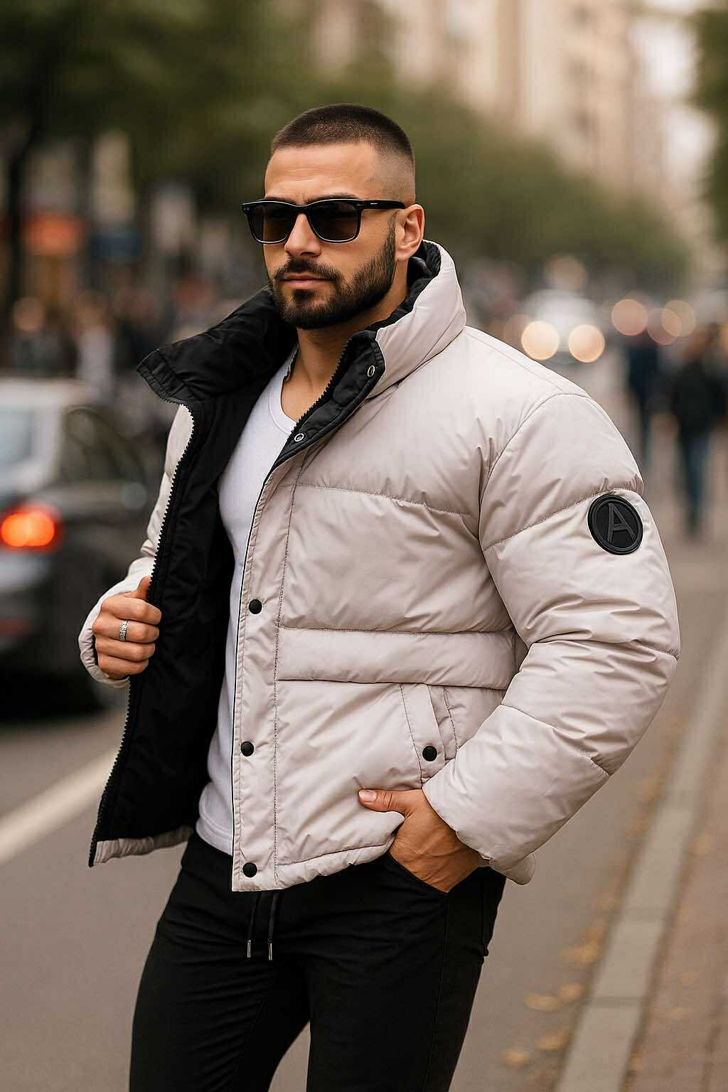 Xhaketë moderne puffer me dizajn urban dhe linja të pastra, perfekte për ditët e ftohta. Kombinimi i ngjyrës bezhë me jakën e zezë krijon kontrast elegant dhe stil të veçantë. E punuar nga material cilësor me mbushje të lehtë për ngrohtësi dhe rehati maksimale, ndërsa jakë e ngritur dhe mbyllja me kopsa shtojnë mbrojtje nga era dhe ftohti.