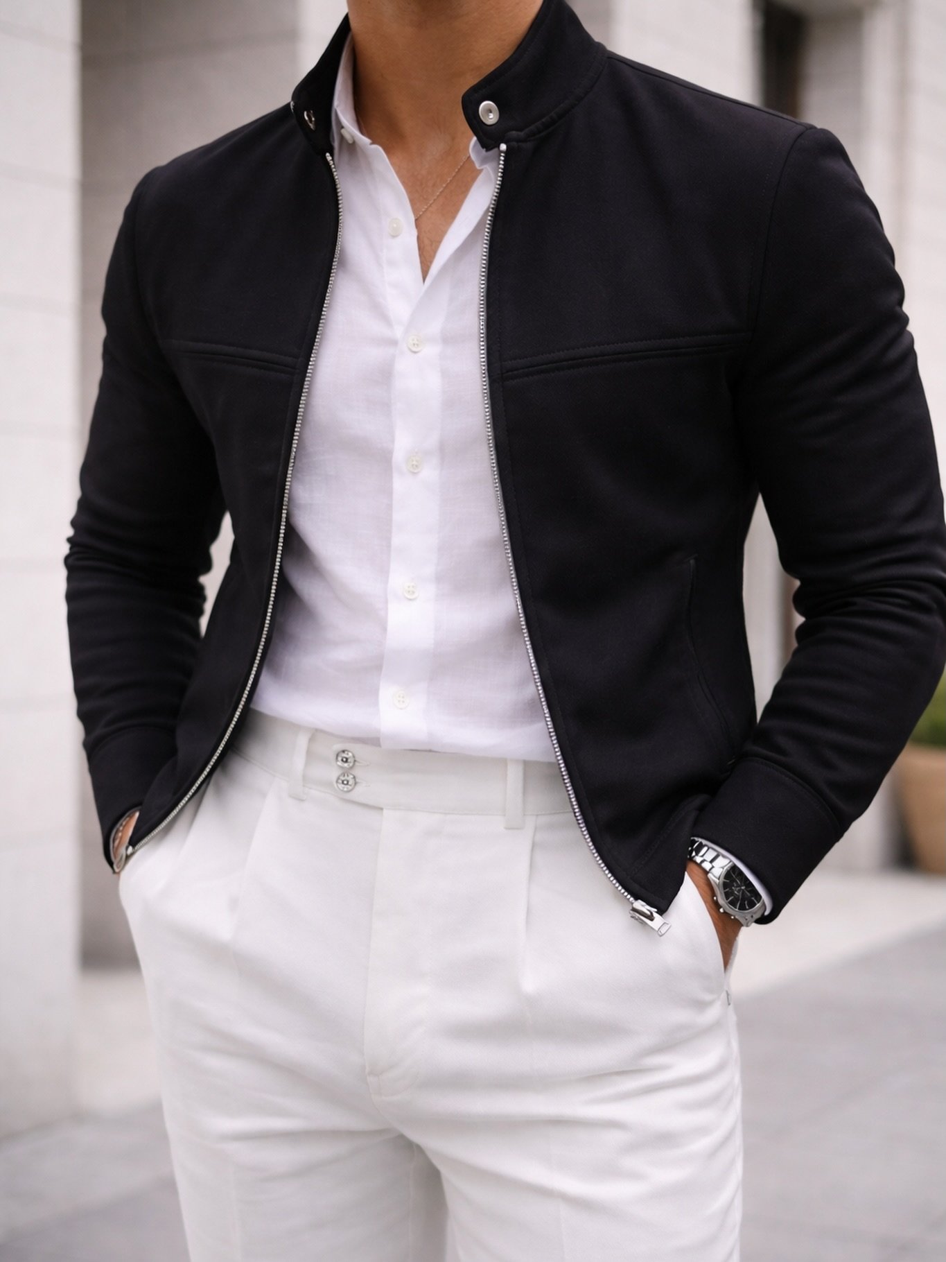 E punuar nga material cilësor, e butë dhe rezistente, xhaketa ka një jakë të ngritur moderne dhe mbyllje me zinxhir metalik që i shton një prekje luksi. Kombinimi me këmishë të bardhë dhe pantallona elegante e bën ideale si për dalje casual, ashtu edhe për evente më formale.