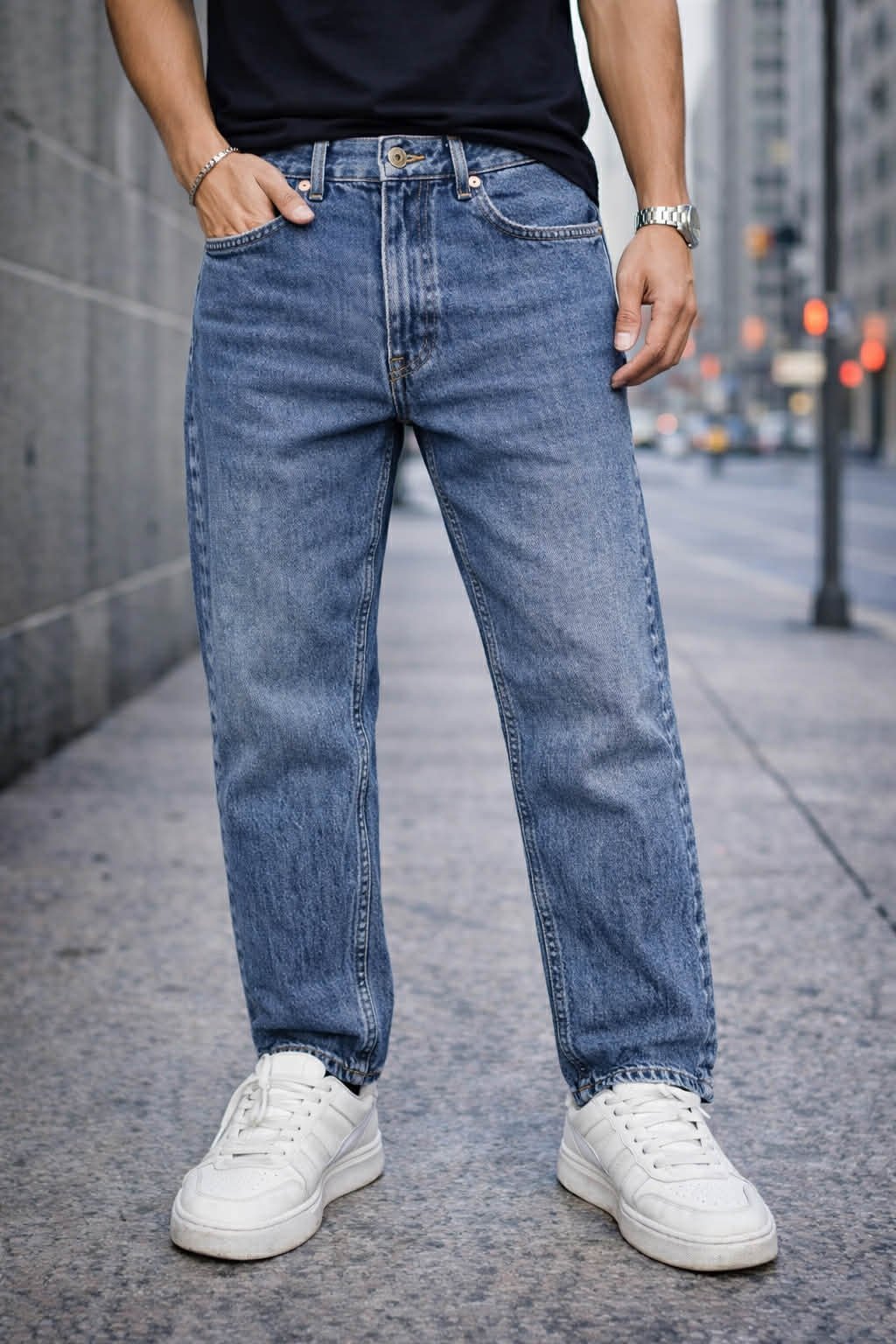 Xhinse në ngjyrë blu klasike (mid blue wash) me prerje relax fit / boyfriend, të dizajnuara për një pamje të pastër, urbane dhe shumë komode. Denimi cilësor ofron balancë perfekte mes strukturës dhe rehatisë, duke i bërë të përshtatshme për përdorim të përditshëm.