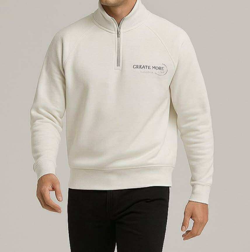 Kjo bluzë e bardhë me zip gjysmë është një pjesë thelbësore e stilit modern urban. E realizuar nga material pambuku cilësor me ndjesi të butë, ajo ofron rehati maksimale dhe pamje të pastër elegante. Detaji “CREATE MORE” në gjoks shton një prekje origjinale dhe kreative, ndërsa zip-i i shkurtër në pjesën e përparme lejon përshtatje sipas dëshirës.