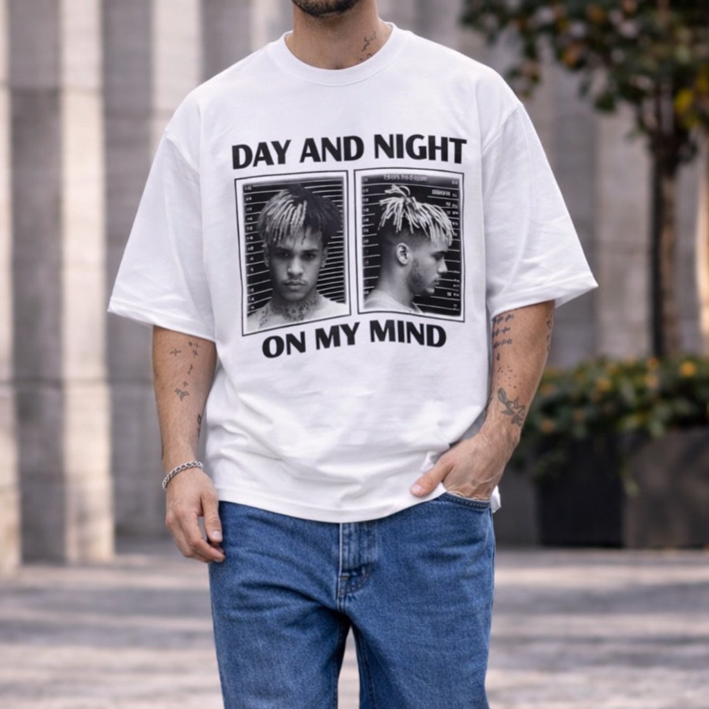 Bluzë oversize me print grafik “Day and Night – On My Mind”, e krijuar për ata që duan të shprehin stilin dhe personalitetin përmes veshjes. Dizajni me ilustrim bardhë e zi i jep një vibe urban dhe modern, perfekt për streetwear.