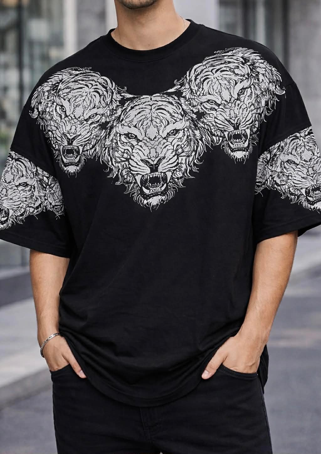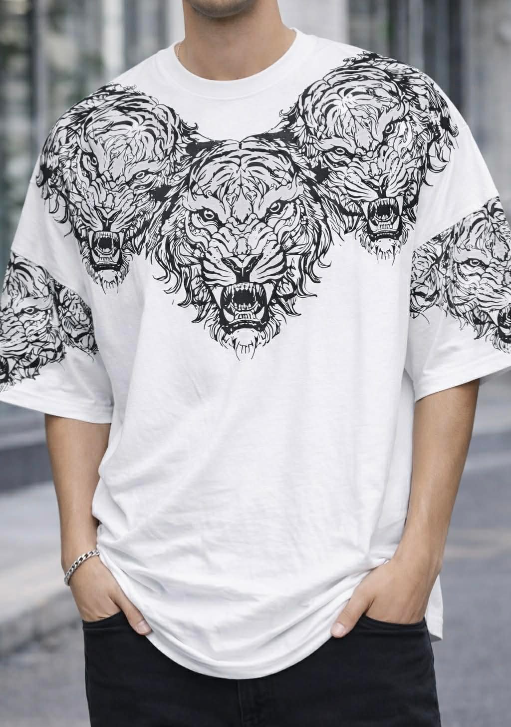Bluzë oversize me dizajn të fuqishëm grafik me luanë, që simbolizon forcë, dominim dhe karakter. Printi i detajuar në pjesën e sipërme krijon një efekt vizual të fortë dhe unik, perfekt për një stil streetwear që bie në sy.
