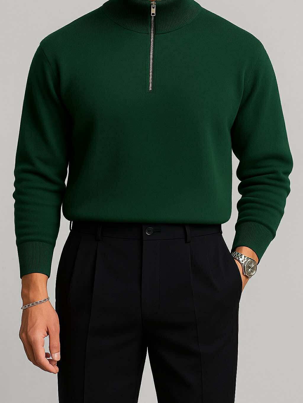 Ky half-zip jeshil premium është simbol i elegancës moderne me prekje të guximshme. Materiali cilësor dhe ndjesia e butë sigurojnë komoditet gjatë gjithë ditës, ndërsa ngjyra jeshile e thellë i jep karakter dhe sofistikim çdo kombinimi. Zinxhiri metalik krom shton një detaj luksoz që e bën këtë pjesë perfekte për stil “smart casual” ose veshje elegante urbane.