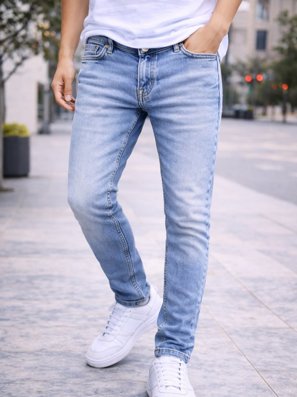 Jeans Slim-Fit në Ngjyrë Blu e Çelët – Stil Casual & Modern