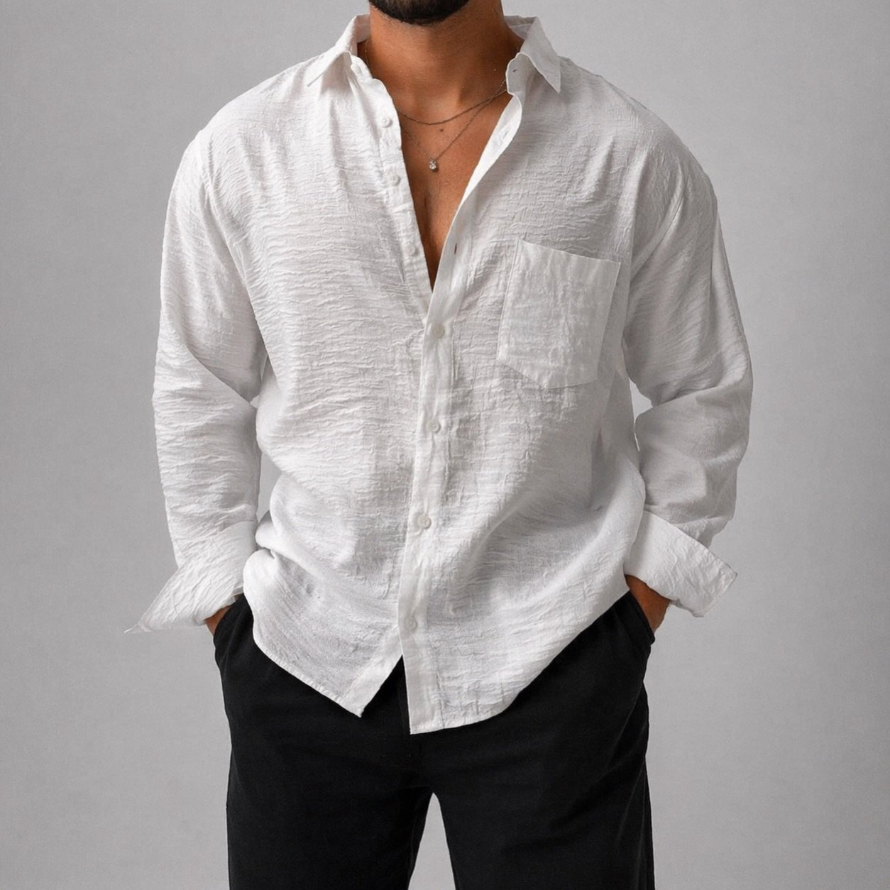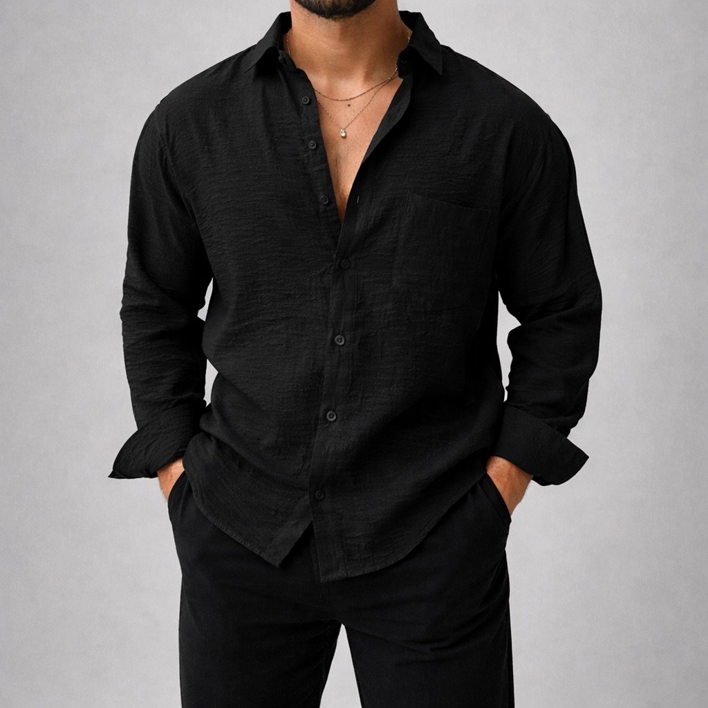 Kjo këmishë premium është zgjedhja ideale për një stil të pastër, modern dhe effortless. Me një teksturë të lehtë dhe dizajn minimalist, ajo sjell elegancë pa u munduar shumë – perfekte si për ditë pune ashtu edhe për dalje casual.
