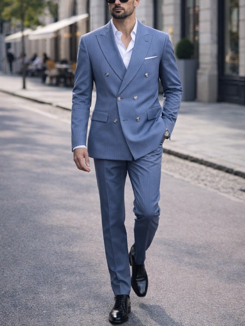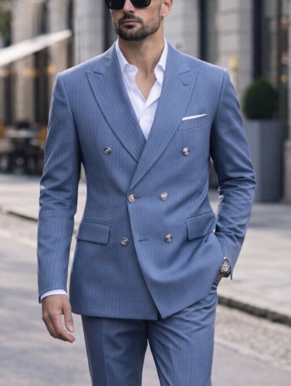 Kostum për meshkuj në nuancë blu të hapur me vija të holla, i krijuar për një pamje moderne, të pastër dhe shumë elegante. Xhaketa dopiopet me detaje premium i jep karakter të sofistikuar, ndërsa prerja e rregullt e bën ideal për evente formale, ceremoni dhe takime biznesi. Kombinimi me këmishë të bardhë dhe këpucë klasike e kompleton një stil luksoz dhe të rafinuar.