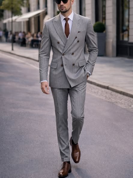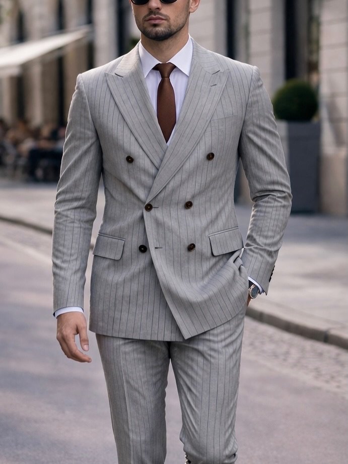 Kostum elegant për meshkuj në ngjyrë gri të hapur me vija të holla pinstripe, i dizajnuar për një pamje klasike, moderne dhe shumë të sofistikuar. Xhaketa dopiopet shton një prekje premium dhe formale, ndërsa prerja slim-fit thekson siluetën me finesë. Ky kostum është zgjedhja ideale për dasma, evente formale, takime biznesi dhe raste speciale ku kërkohet stil i pastër dhe prezencë elegante.