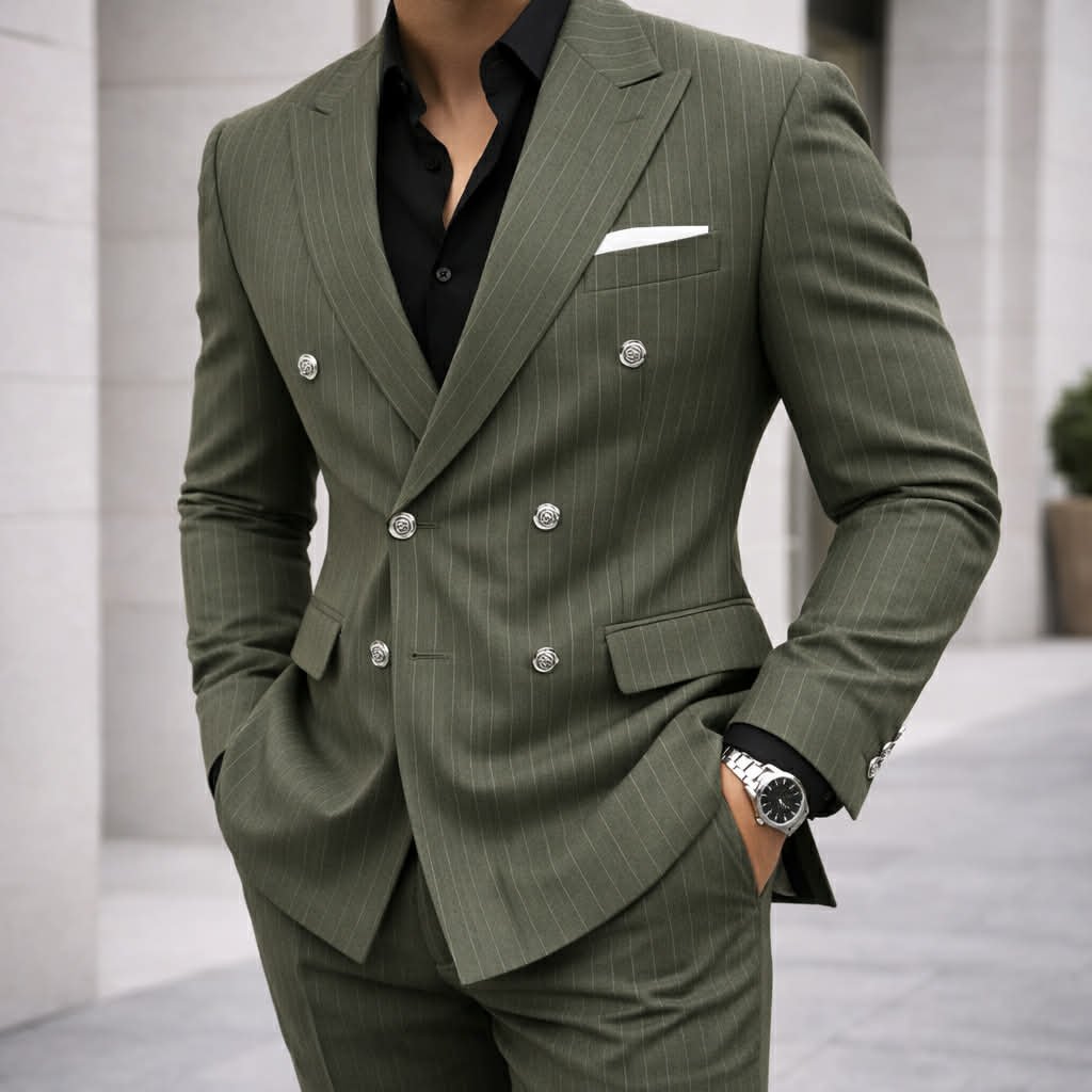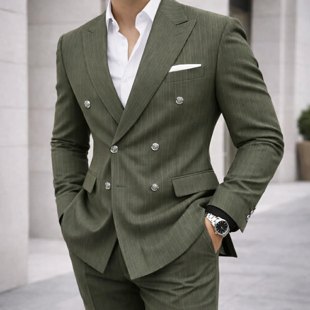 Ky kostum modern në ngjyrë jeshile ulliri me vija të holla vertikale kombinon elegancën klasike me stilin bashkëkohor. Xhaketa është model double-breasted me kopsa metalike dekorative, duke i dhënë një pamje të sofistikuar dhe autoritare. Prerja është slim-fit, që thekson linjat e trupit për një paraqitje të pastër dhe të rafinuar.