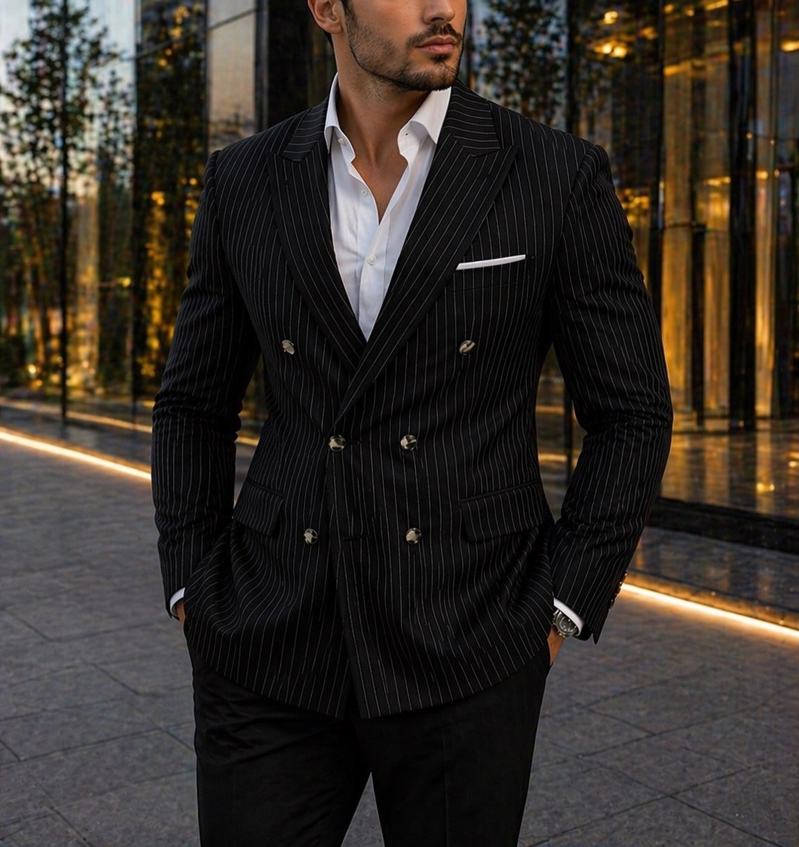 Xhaketa dopio-kopshe me vija vertikale të holla krijon një efekt vizual që zgjat trupin dhe rrit prezencën, ndërsa detajet e përpunuara me kujdes dhe materialet cilësore sigurojnë komoditet dhe qëndrueshmëri. Ky kostum është zgjedhja ideale për ambiente biznesi, evente formale dhe raste ku kërkohet një paraqitje me klas dhe autoritet.