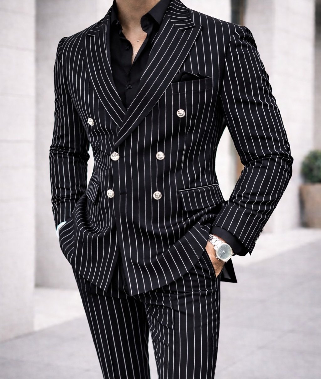 Ky kostum elegant me vija të holla është zgjedhja perfekte për meshkujt që kërkojnë një pamje të sofistikuar dhe moderne. Dizajni double-breasted me kopsa metalike i jep një stil klasik të rifreskuar, ndërsa prerja slim-fit thekson linjat trupore për një paraqitje të pastër dhe të rafinuar. I kombinuar me një këmishë të zezë, ky kostum është ideal për evente formale, takime biznesi apo dalje elegante.