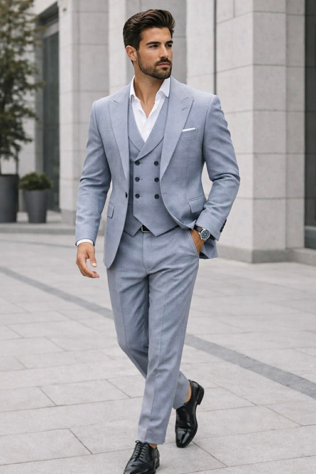 Prerja slim fit thekson linjat trupore duke krijuar një siluetë të pastër dhe të balancuar, ndërsa jeleku dopio-kopsa shton një shtresë shtesë elegance dhe formaliteti. Ngjyra gri e çelët sjell freski dhe rafinim, duke e bërë këtë kostum ideal për evente të rëndësishme, ceremoni, apo ambiente biznesi ku kërkohet prezencë e nivelit të lartë.