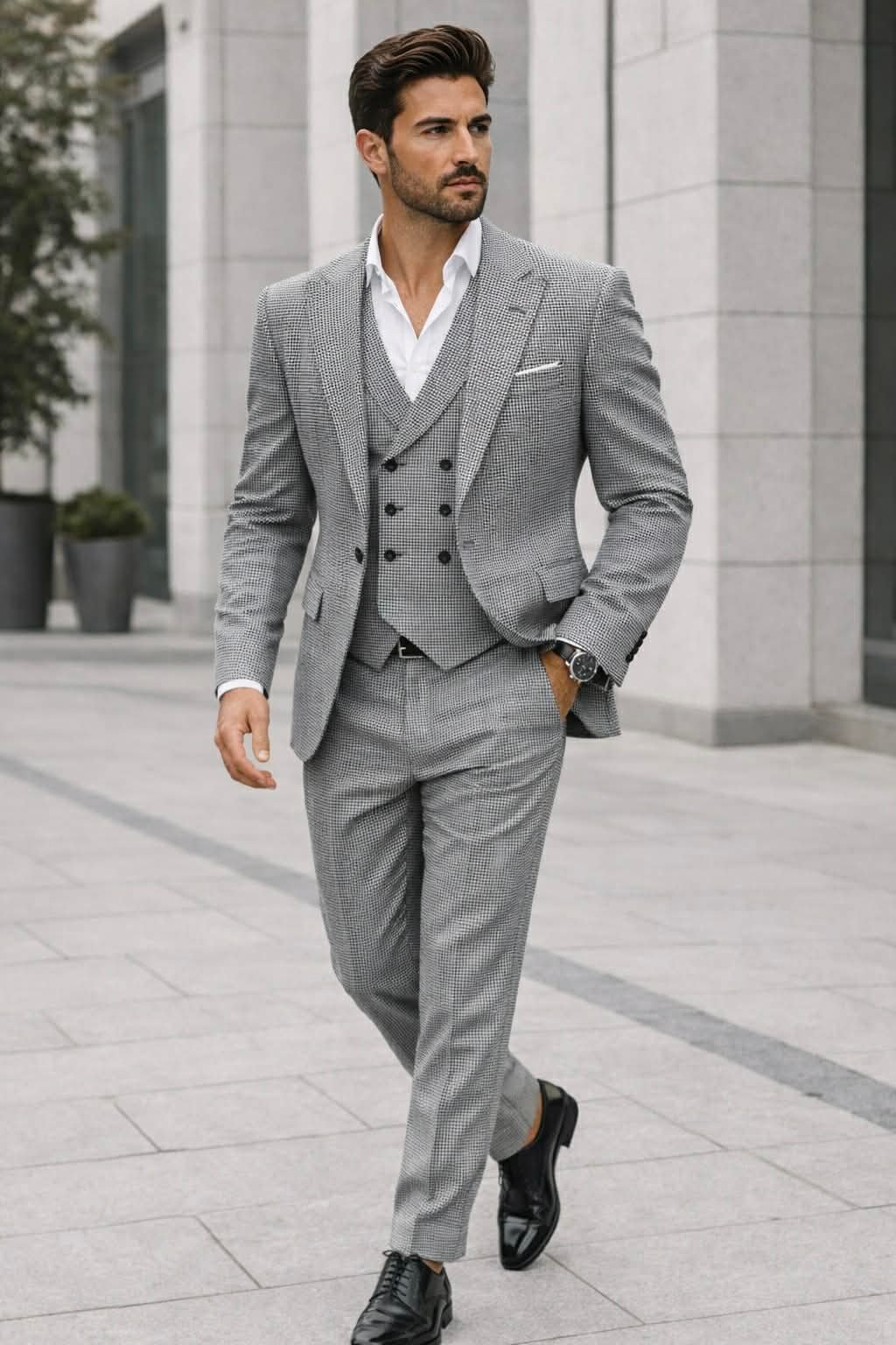 Dizajni slim fit krijon një siluetë të strukturuar dhe të rregullt, ndërsa jeleku dopio-kopsa shton një shtresë luksi dhe formaliteti. Modeli i imët në material i jep kostumit karakter dhe thellësi vizuale, duke e bërë më interesant se një kostum klasik i thjeshtë. Ngjyra gri e balancuar e bën të lehtë për t’u kombinuar me aksesorë të ndryshëm, duke ruajtur gjithmonë një pamje elegante.