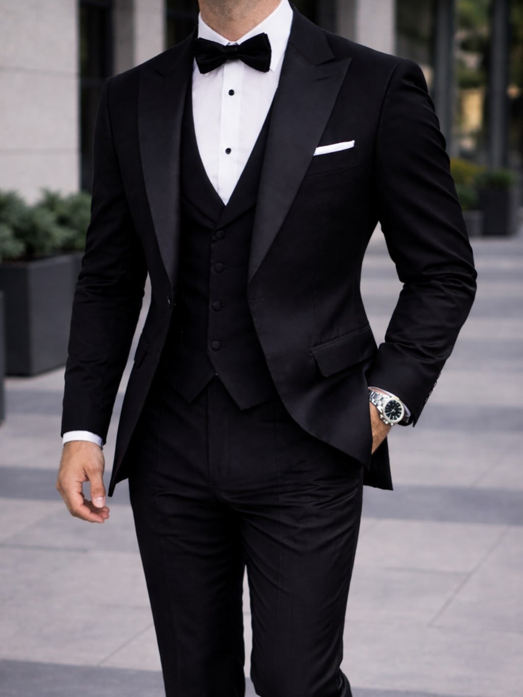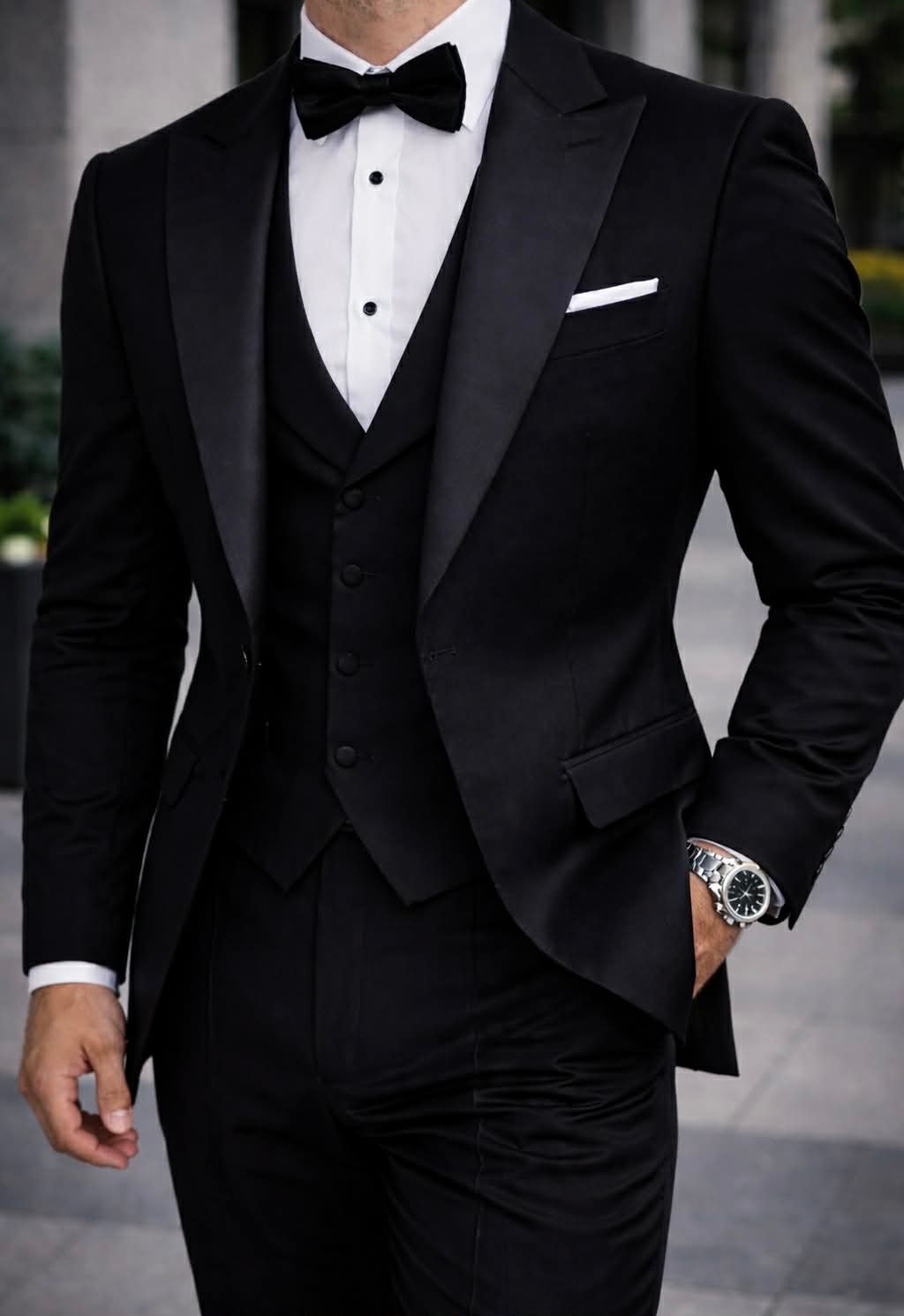 Ky kostum i zi është një shembull i pastër i stilit klasik dhe elegancës moderne. Përbëhet nga një xhaketë smoking me jakë sateni të lëmuar, jelek i përshtatur në mënyrë perfekte dhe pantallona me prerje të ngushtë që theksojnë siluetën. Këmisha e bardhë me kopsa të zeza dhe papioni i zi shtojnë një kontrast të sofistikuar, ndërsa detajet si shami në xhep dhe ora elegante kompletojnë pamjen luksoze.