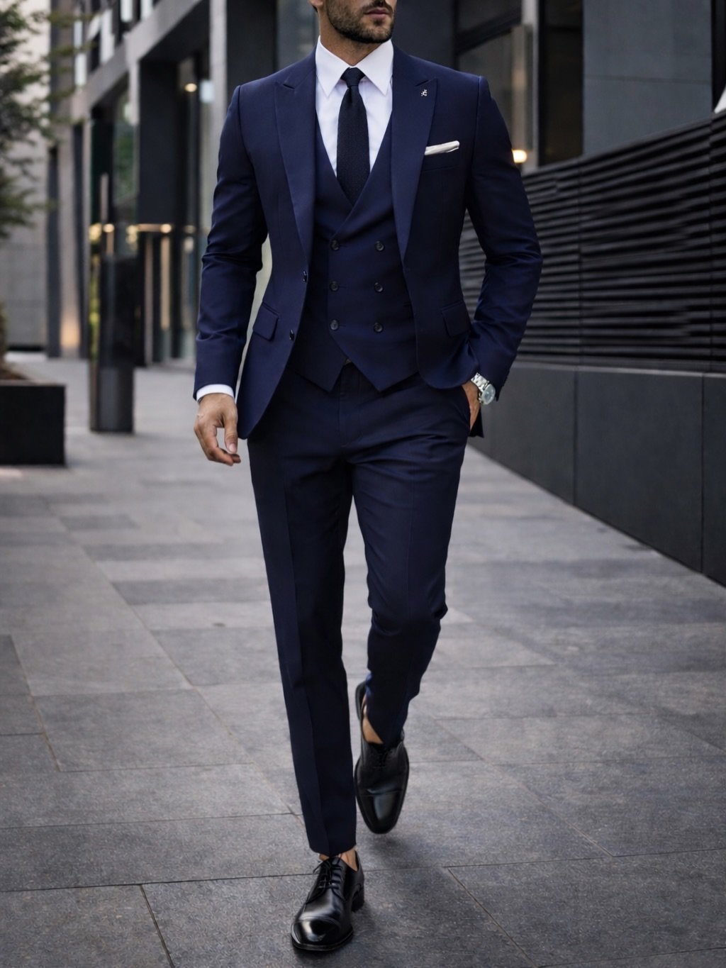 Ngjyra blu e thellë (navy) e bën të përshtatshëm si për evente formale ashtu edhe për takime biznesi apo dalje elegante në qytet. Kombinimi me këmishë të bardhë dhe kravatë të errët krijon një pamje të pastër, të sofistikuar dhe gjithmonë në trend.