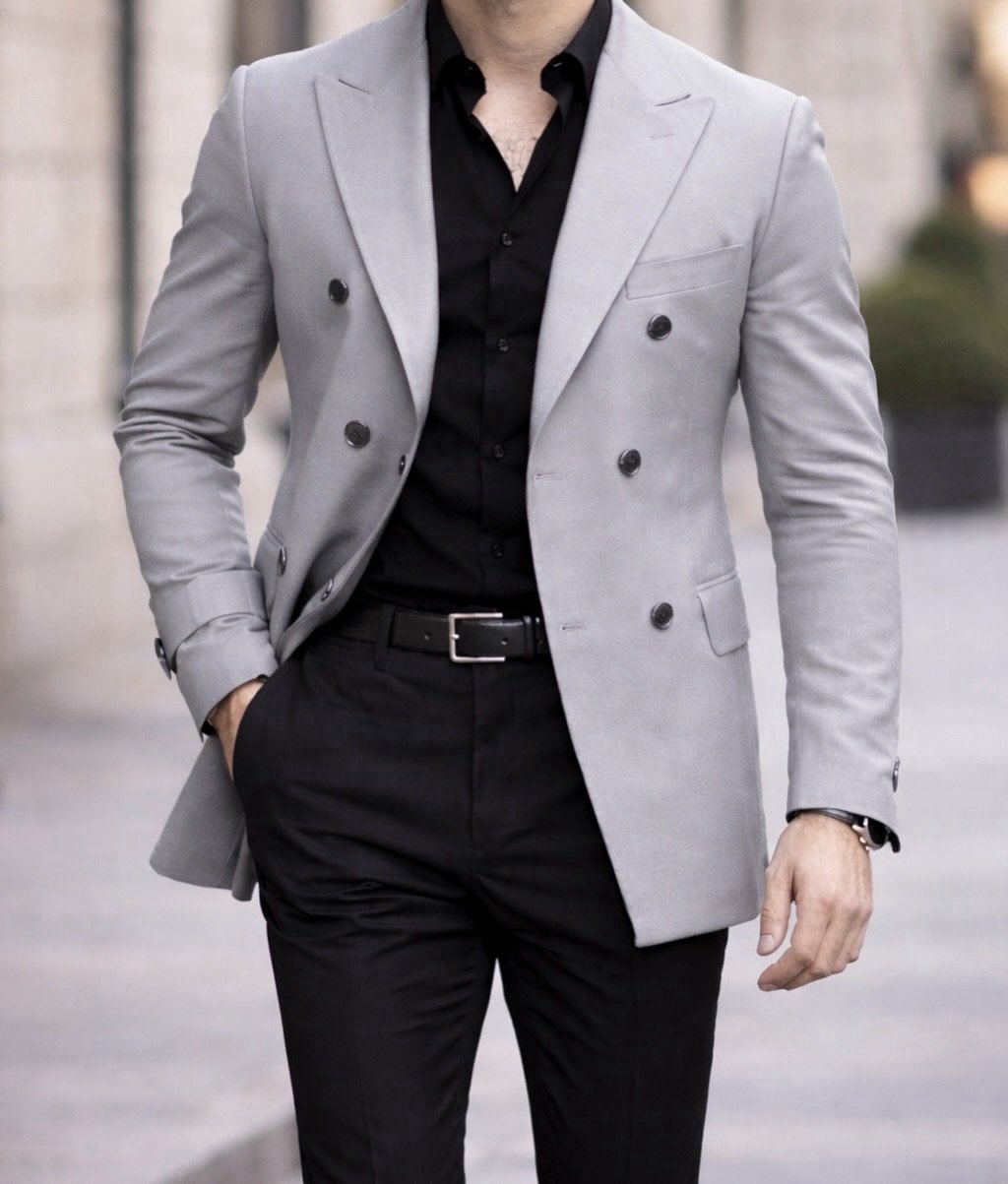 Ky kostum gri e hapur double-breasted është zgjedhje ideale për një paraqitje moderne, elegante dhe premium. Me prerje slim fit dhe linja të pastra, ky model i jep siluetës një pamje të rregullt, të sofistikuar dhe shumë mashkullore. Ngjyra gri e hapur sjell freski dhe finesë, ndërsa kombinimi me këmishën e zezë krijon kontrast të fortë dhe shumë stil.