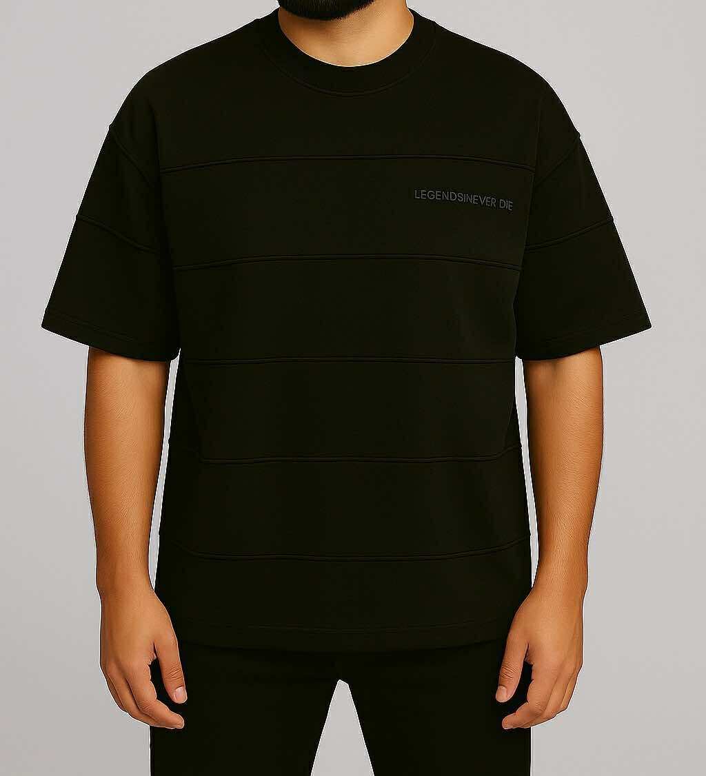 Kjo maicë oversize në ngjyrë të zezë kombinon thjeshtësinë me një mesazh të fortë. Dizajni me vija horizontale të qepura i jep një teksturë moderne, ndërsa printi diskret “Legends Never Die” në pjesën e gjoksit e bën këtë maicë të dallojë me stil urban. Materiali i butë dhe rezistent siguron komoditet gjatë gjithë ditës, ndërsa prerja e lirshme është ideale për kombinime streetwear ose casual. Një pjesë e domosdoshme për ata që duan të shprehin personalitet përmes veshjes.