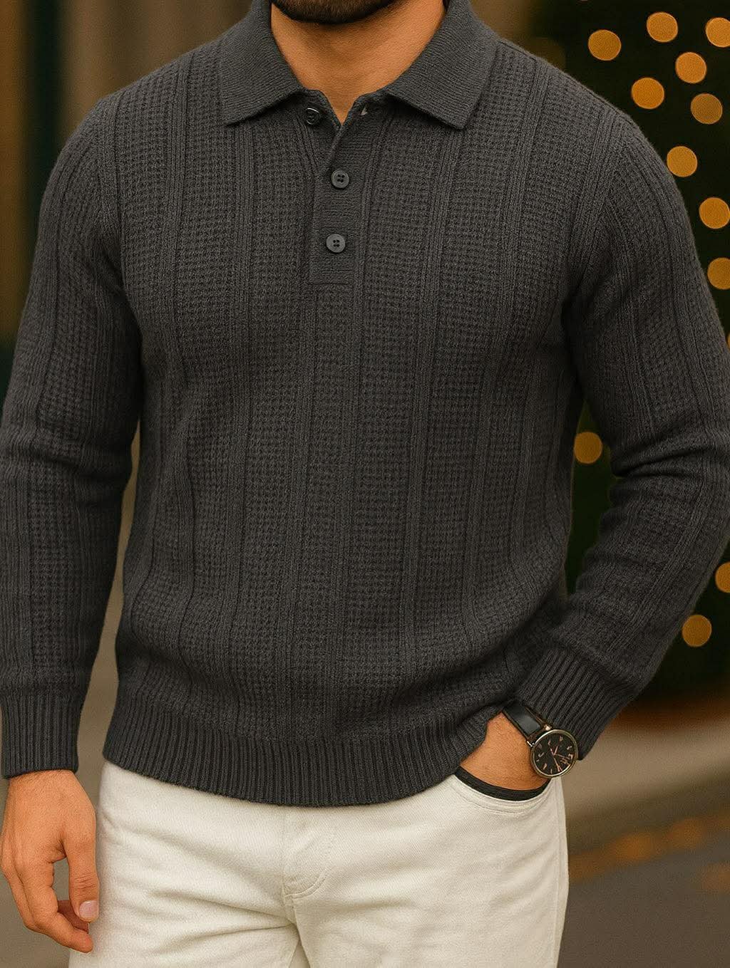 Xhemperi Men’s Premium Textured Ribbed Knit Polo – Dark Grey kombinon strukturën elegante ribbed me një teksturë më të theksuar, duke krijuar një pamje moderne, të ngrohtë dhe tepër premium. I punuar me material cilësor dhe të butë, modeli ofron komoditet maksimal dhe një prerje slim-fit që rri perfekt në trup.
