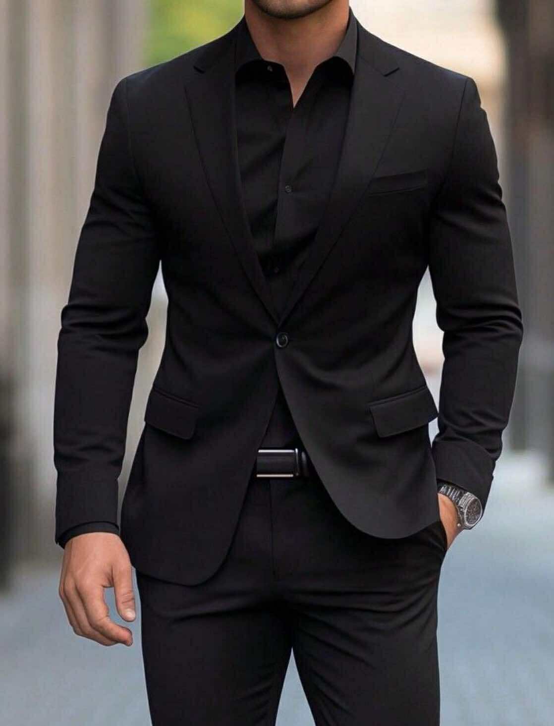 Shpërndani vetëbesim dhe sofistikim me këtë kostum të zi monokrom me prerje të ngushtë. Ideale për evente mbrëmjeje ose për një deklaratë të guximshme mode, kjo veshje elegante kombinon një xhaketë dhe pantallona të qepura me një këmishë të zezë të përshtatshme për një pamje moderne dhe pa ndërprerje.
