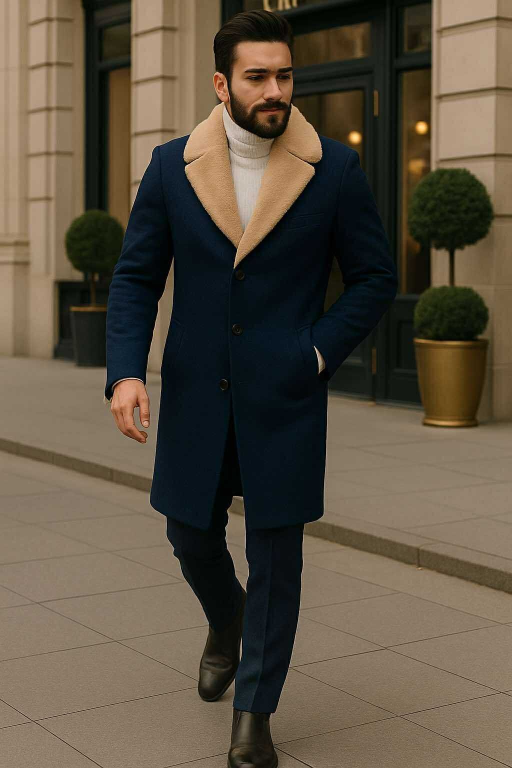 Kjo pallto navy blue me jakë bezh prej shearling është përkufizimi i finesës moderne. Me prerje të drejtë, material premium dhe kontrast ngjyrash që tërheq vëmendjen, ky model përshtatet në mënyrë të përkryer për meshkujt që kërkojnë elegancë, ngrohtësi dhe stil të sofistikuar në të njëjtën kohë. Jakë bezh prej pelushi i jep një prekje luksoze, ndërsa kombinimi me golf të bardh dhe çizme lëkure krijon pamjen perfekte “Urban Classic”.