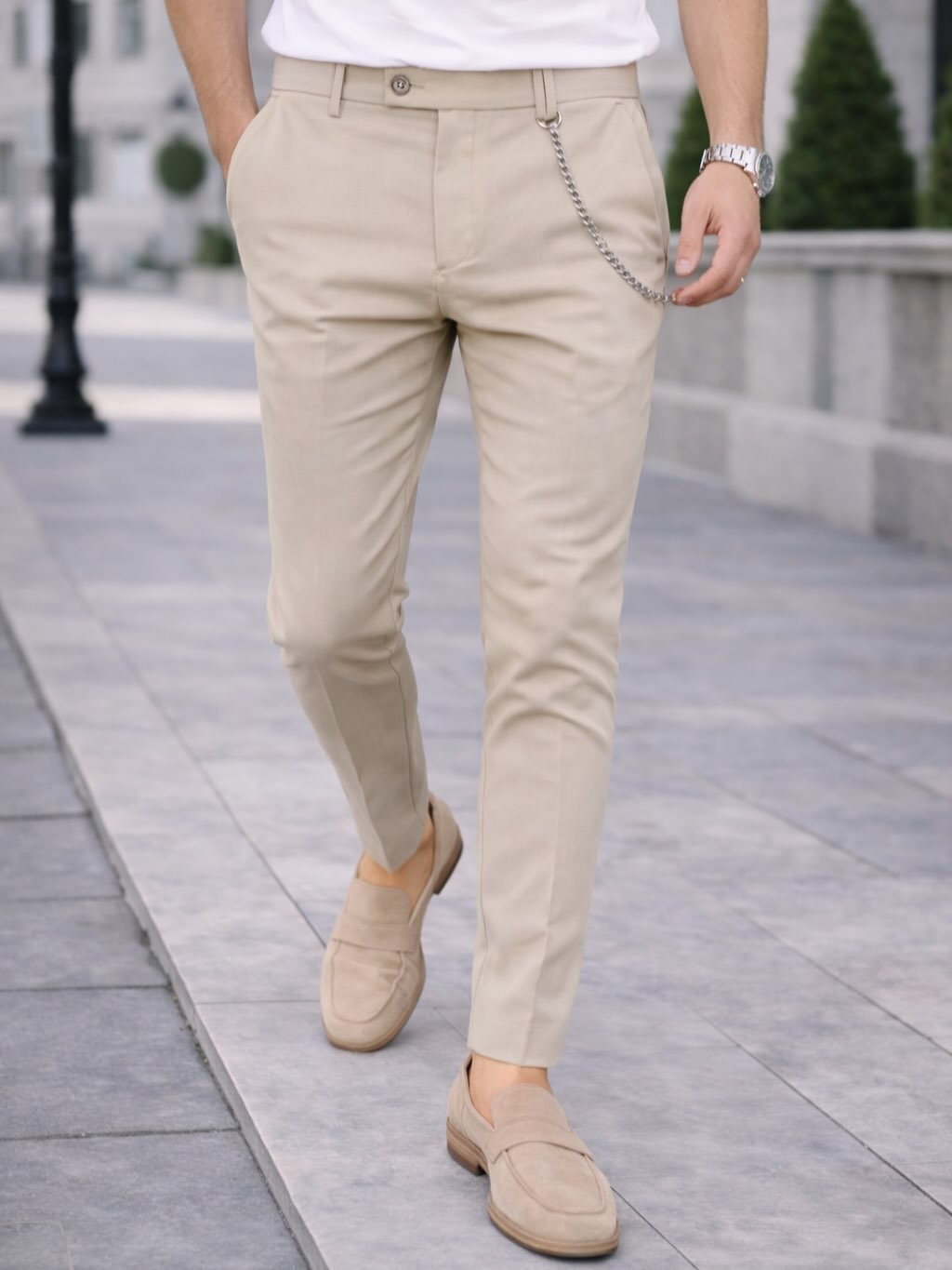 Këto pantallona në ngjyrë bezhë janë një zgjedhje ideale për një stil elegant dhe të freskët, veçanërisht gjatë sezonit pranverë/verë. Me prerje slim-fit dhe gjatësi moderne mbi kyç, ato krijojnë një siluetë të pastër dhe bashkëkohore. Detaji me zinxhir dekorativ shton një element trendi, ndërsa kombinimi me këpucë bezhë krijon një look harmonik dhe shumë stil.
