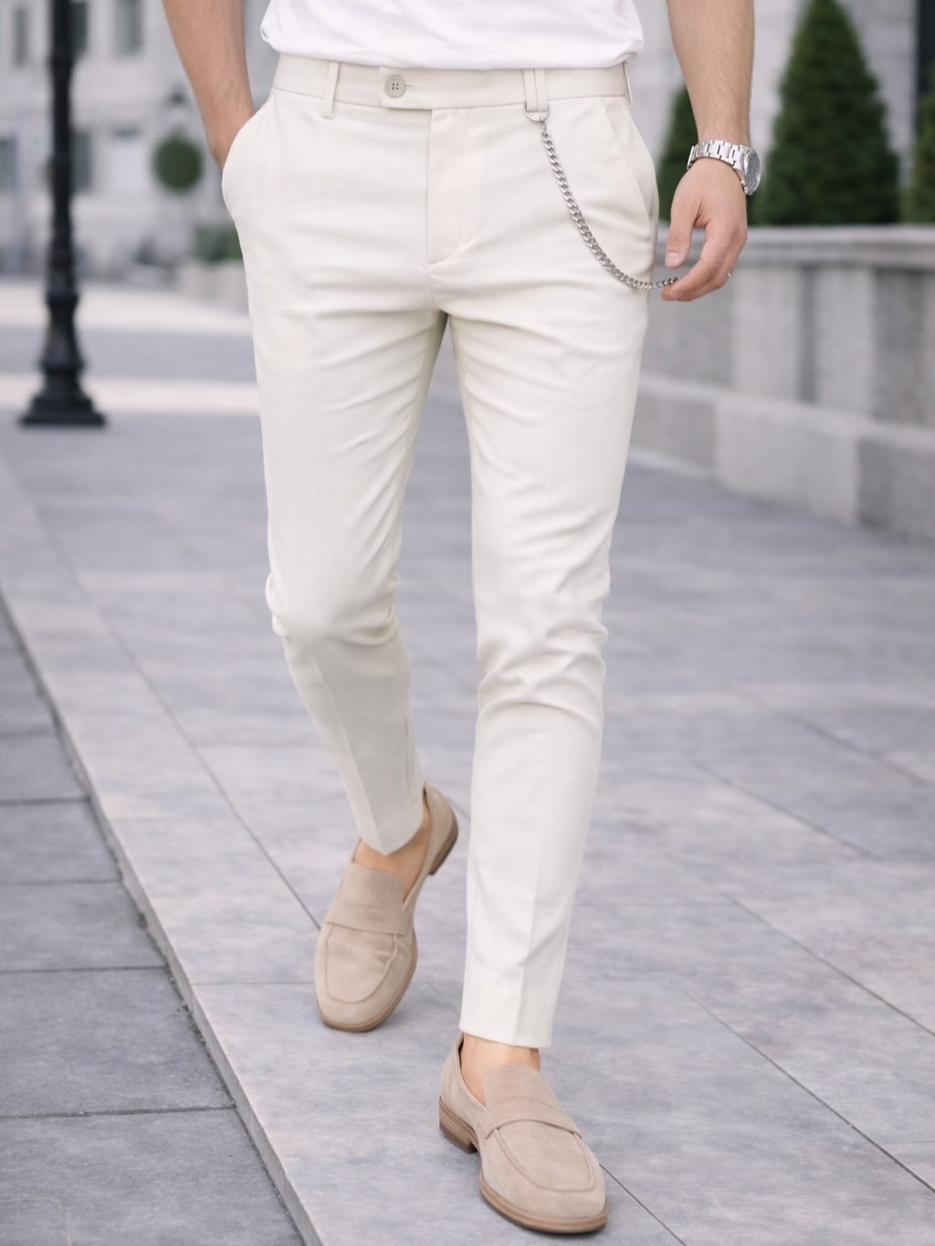 Këto pantallona në ngjyrë bezhë të çelët janë zgjedhja perfekte për një look të pastër, elegant dhe veror. Me prerje slim-fit dhe gjatësi moderne mbi kyç, ato krijojnë një siluetë të rregullt dhe bashkëkohore. Ngjyra e hapur sjell freski dhe lehtësi në kombinim, ndërsa detaji me zinxhir dekorativ shton një element modern dhe stil unik.