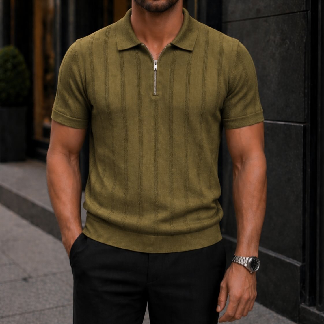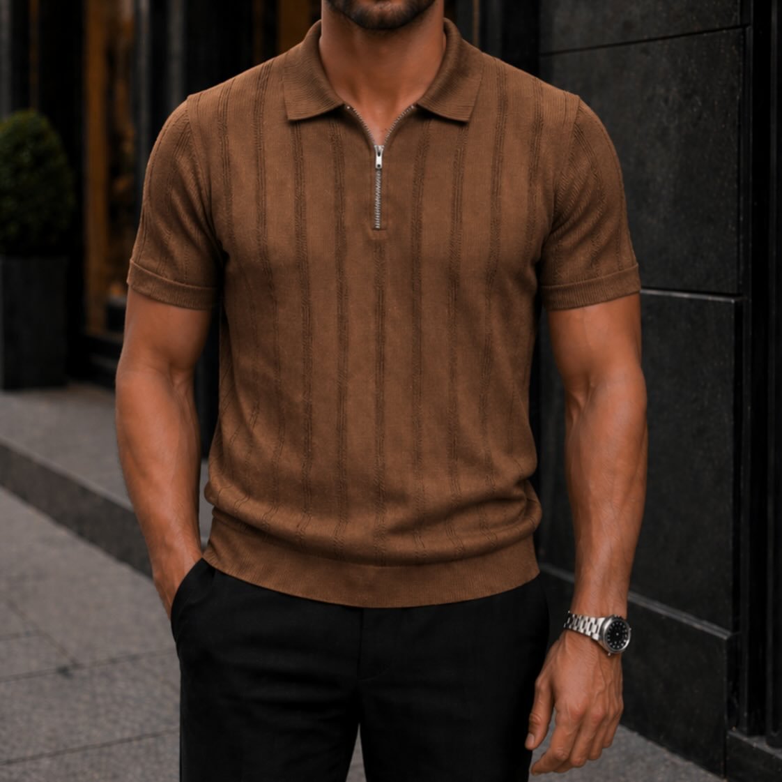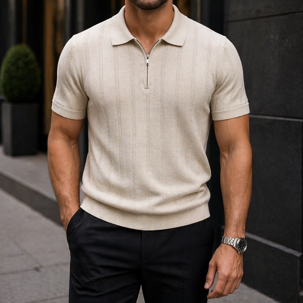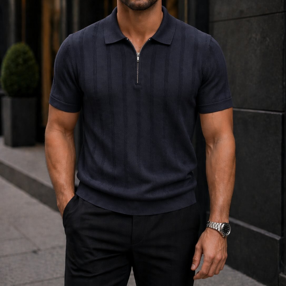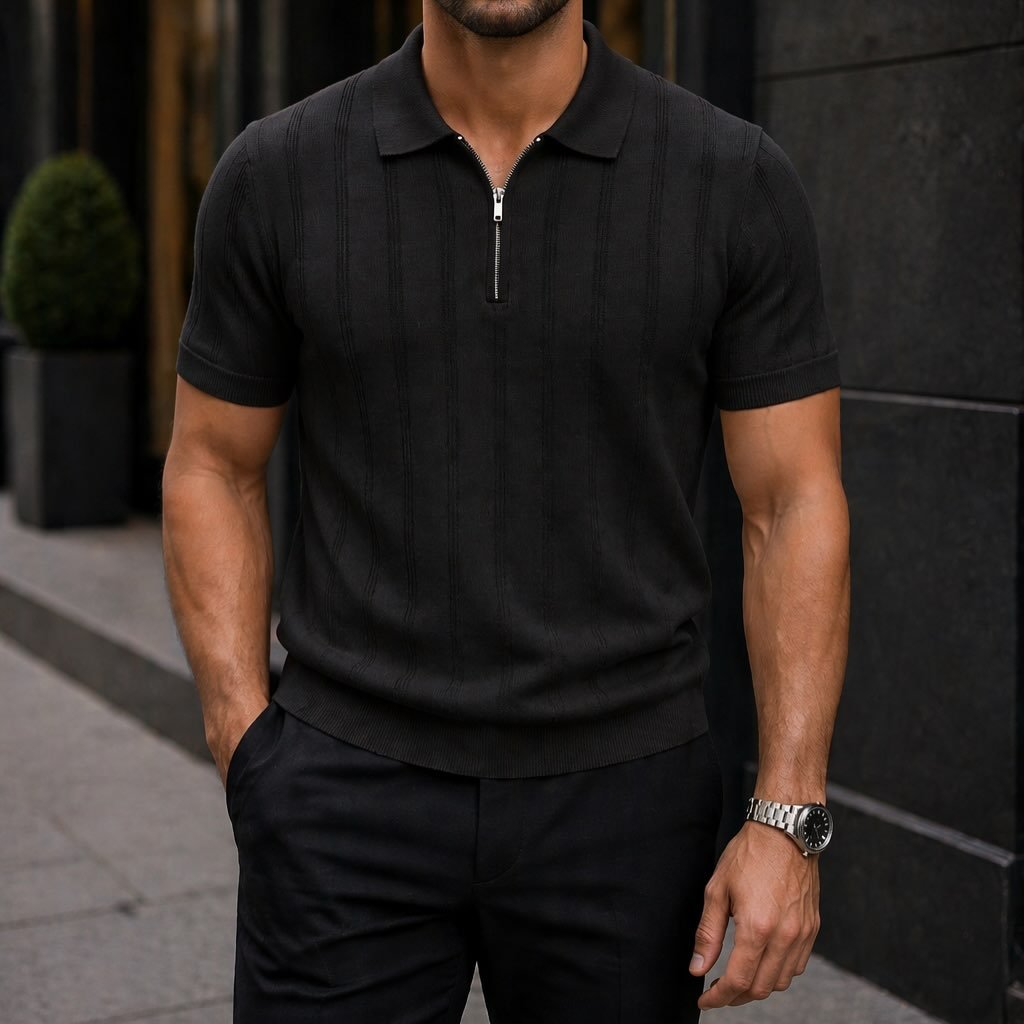 Polo Premium me Zinxhir dhe Teksturë Vertikale – Elegancë Moderne për Meshkuj