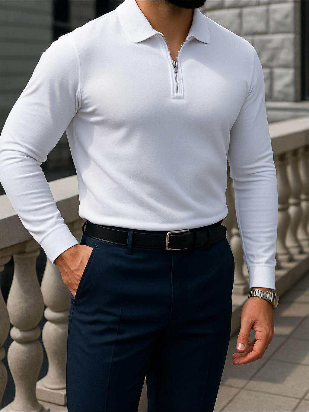 Bluzë polo me mëngë të gjata dhe gjysmë-zip në ngjyrë të bardhë, një zgjedhje klasike dhe premium për çdo gardërobë mashkullore. Materiali cilësor dhe prerja e rregullt ofrojnë komoditet maksimal, ndërsa dizajni minimalist shton një elegancë të thjeshtë. Ideale për kombinime smart-casual, takime apo dalje elegante ku kërkohet një pamje e pastër dhe e rafinuar.