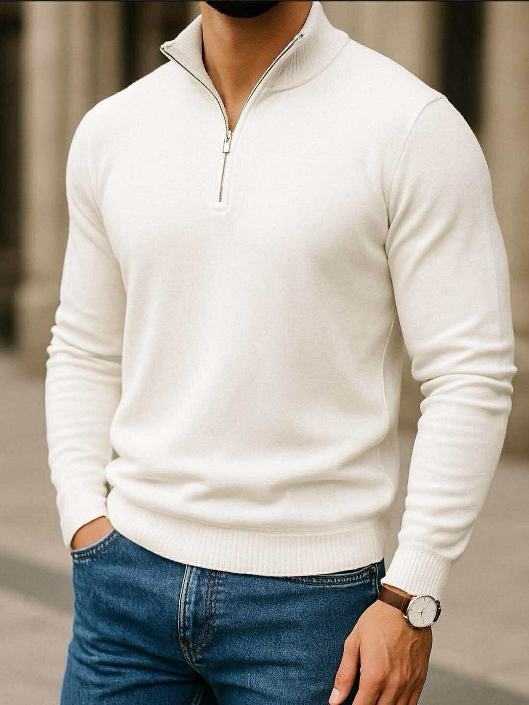Pulovër polo-zip në ngjyrë të bardhë klasike, me dizajn të pastër dhe të gjithanshëm. Realizuar nga material cilësor trikotazh që siguron rehati dhe qëndrueshmëri, me jakë gjysmë-zinxhir që i jep një pamje moderne e të sofistikuar. Kombinohet lehtësisht me xhinse për stil të përditshëm ose me pantallona klasike për një paraqitje më elegante.