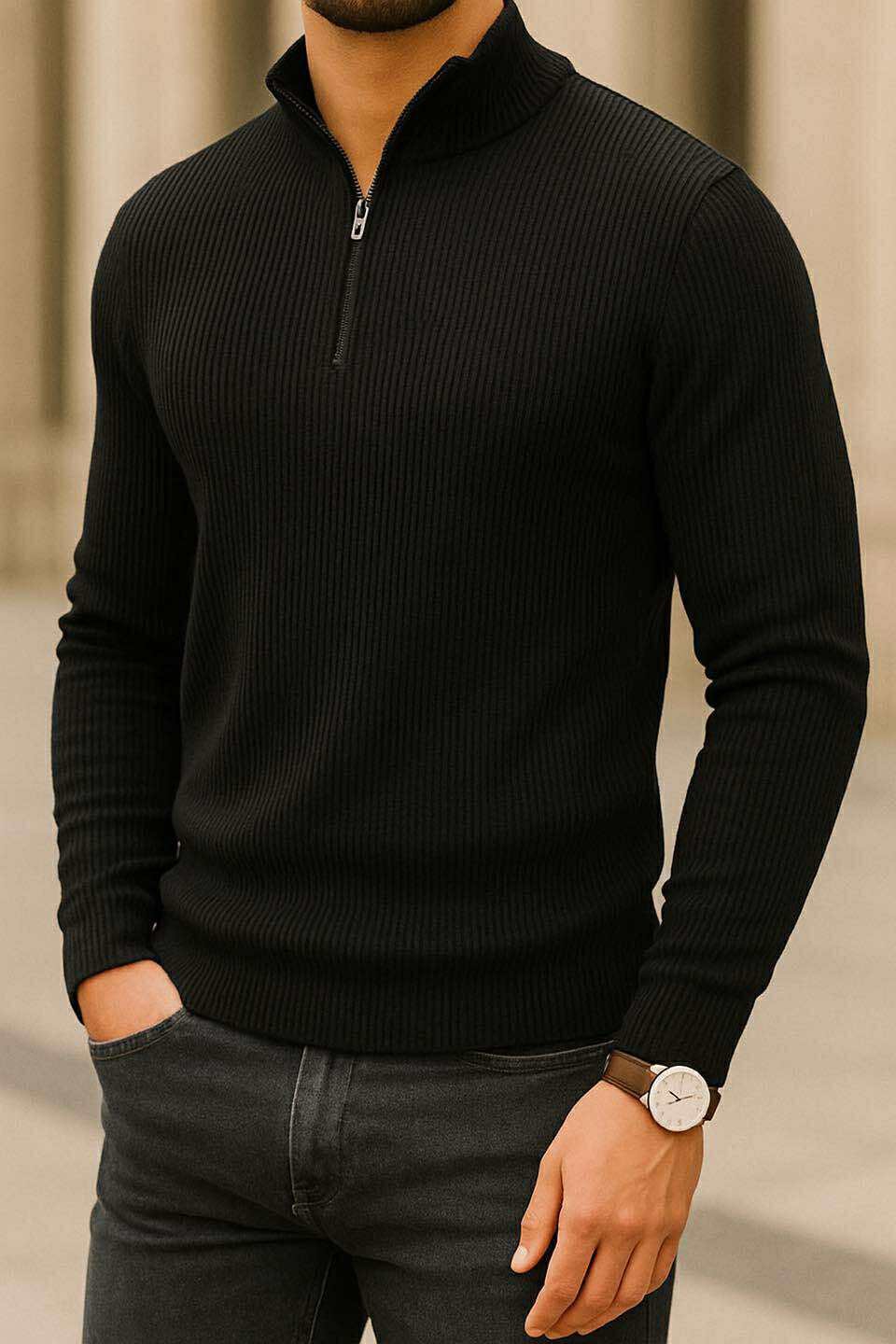 Pulovër polo-zip me vija vertikale, i dizajnuar për një stil modern dhe të gjithanshëm. Përpunuar nga material trikotazh cilësor, ofron komoditet dhe elegancë. Jakë me zinxhir gjysmë e hapur që sjell një prekje të sofistikuar, i përshtatshëm si për kombinime të përditshme me xhinse, ashtu edhe për një paraqitje më elegante me pantallona klasike.