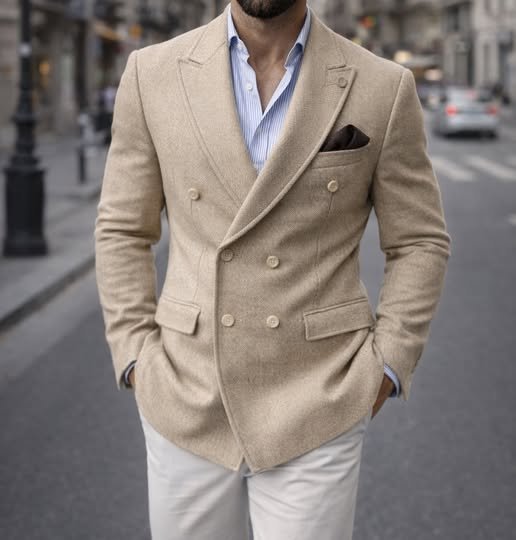 Sako elegante në ngjyrë bezh me prerje slim fit dhe dizajn double-breasted, e krijuar për mashkullin që kërkon të duket me klas, stil dhe prezencë luksoze. Nuanca bezh e kombinuar me këmishë me vija baby blue dhe pantollona të bardha krijon një pamje shumë të pastër, të shtrenjtë dhe perfekte për sezonin pranverë-verë.