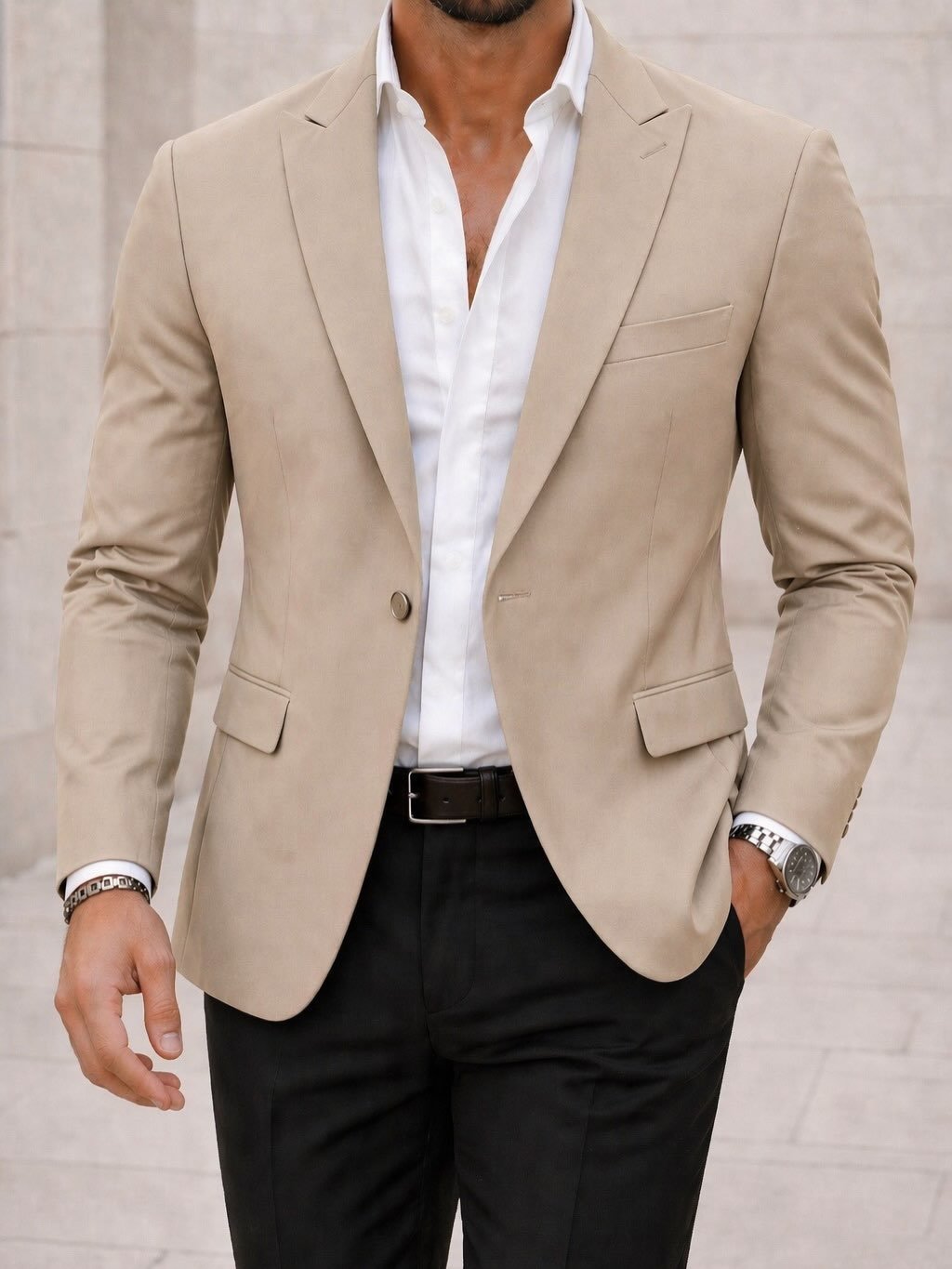 Ky sako premium në nuancë beige të hapur është zgjedhja perfekte për një stil të freskët, elegant dhe modern. Me prerje slim-fit dhe dizajn minimalist, ai krijon një siluetë të pastër dhe të sofistikuar, ideale për sezonet e ngrohta dhe kombinime të lehta.