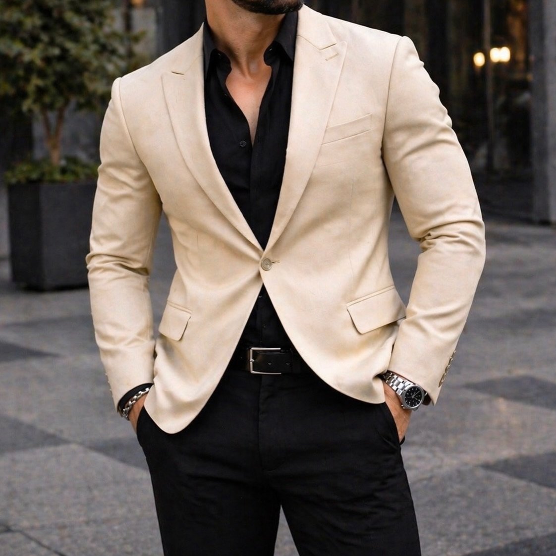 Ngjyra beige sjell një ndjesi lehtësie dhe sofistikimi, perfekte për sezonet pranverë/verë apo për kombinime smart-casual. I kombinuar me këmishë të zezë ose të bardhë, ky sako krijon kontrast tërheqës dhe stil modern. Materiali cilësor dhe përpunimi i kujdesshëm sigurojnë rehati maksimale dhe jetëgjatësi.