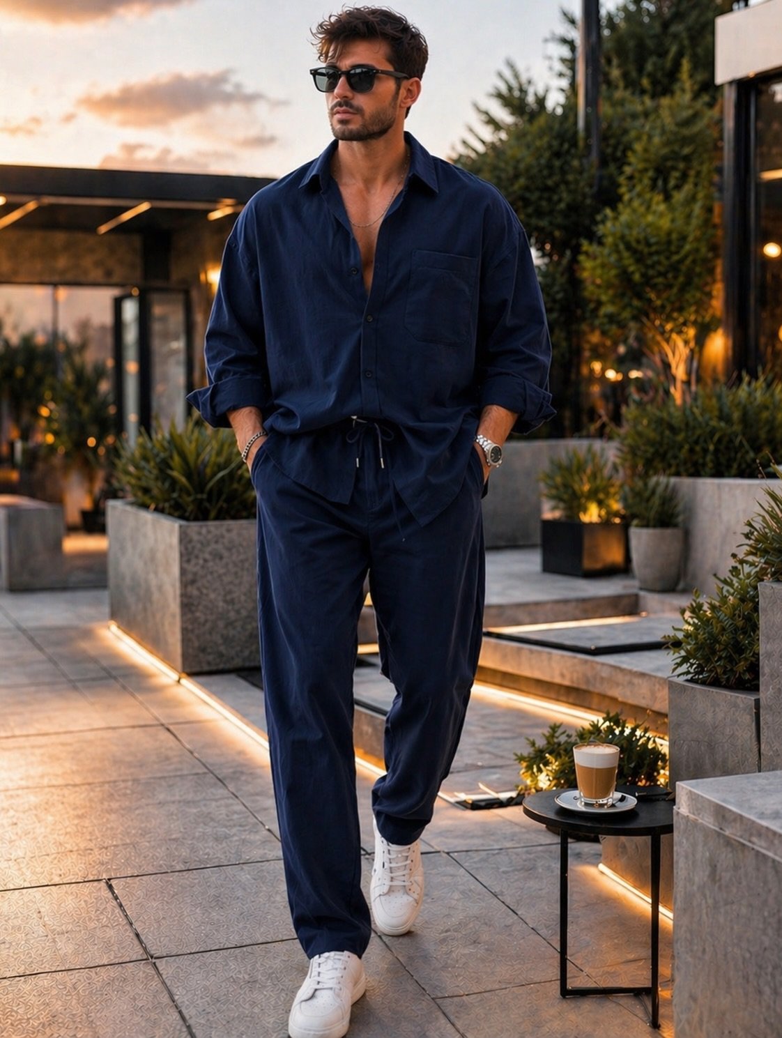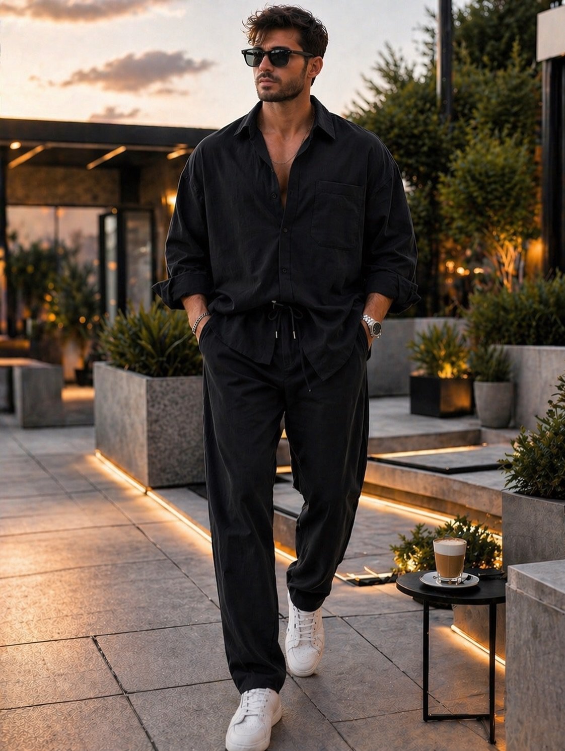 Ky set casual premium mashkullor është dizajnuar për stil modern, rehati maksimale dhe elegancë të relaksuar. I përbërë nga këmishë me prerje të lirë dhe pantallona me bel elastik me lidhëse, ky outfit është perfekt për sezonin veror dhe stilin smart-casual.