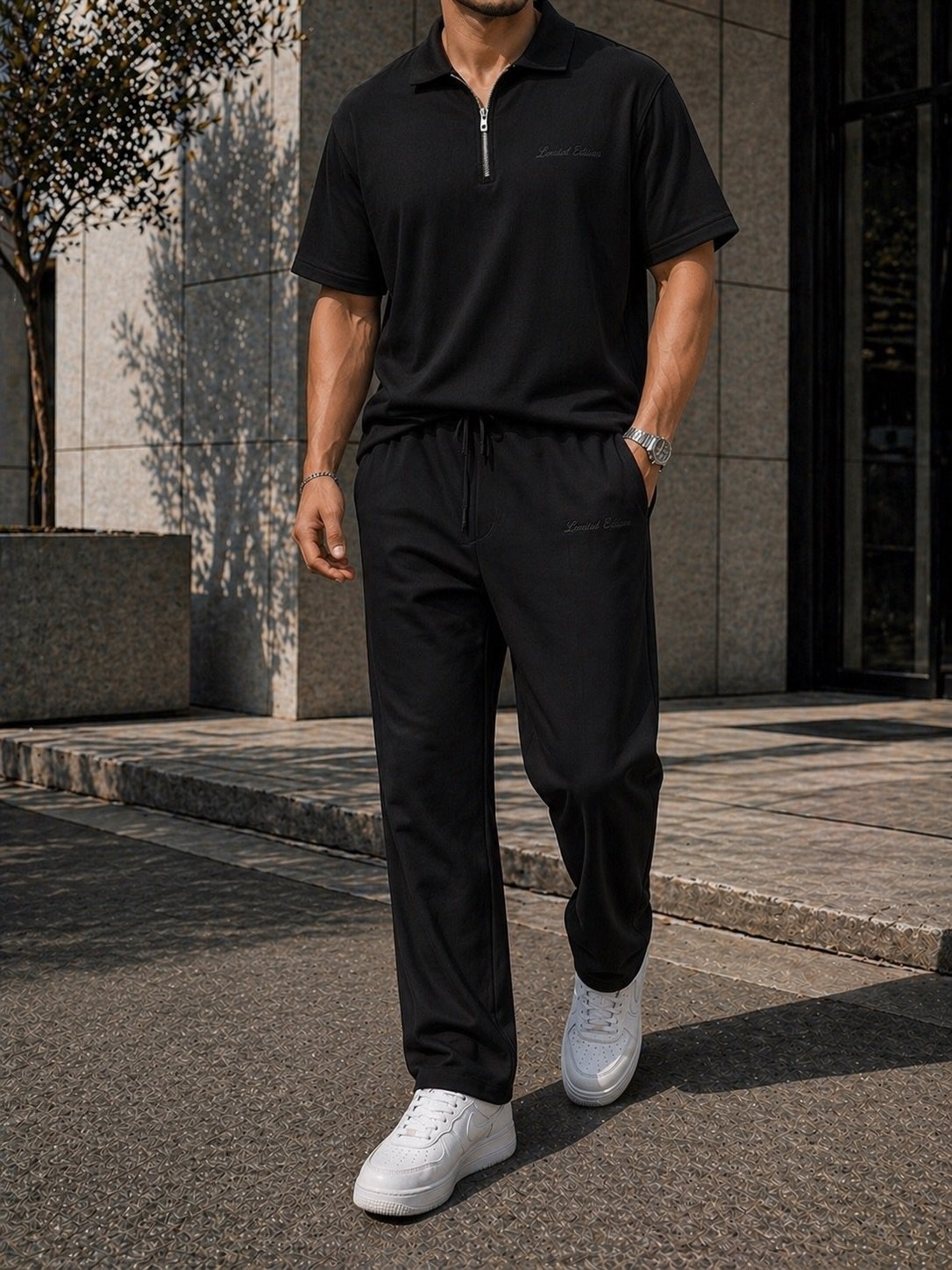 Ky set modern për meshkuj kombinon stilin sportiv me elegancën minimale, duke krijuar një look perfekt për përditshmëri dhe dalje casual. Përbëhet nga një bluzë polo me zinxhir në pjesën e jakës dhe pantallona me prerje të rehatshme, që ofrojnë komoditet maksimal gjatë gjithë ditës.
